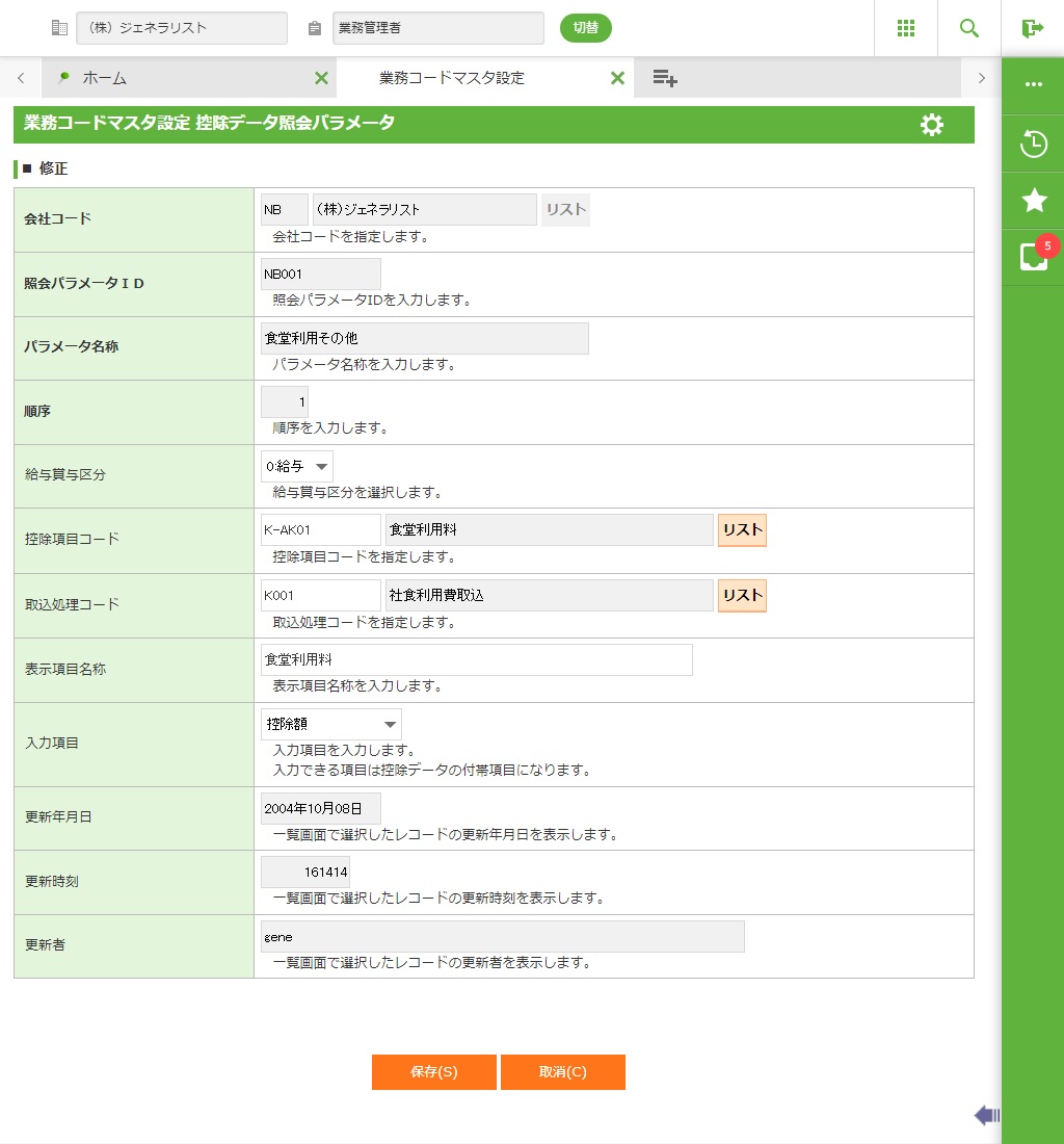 控除データ照会パラメータを新規登録します。詳細画面が表示されます。 |