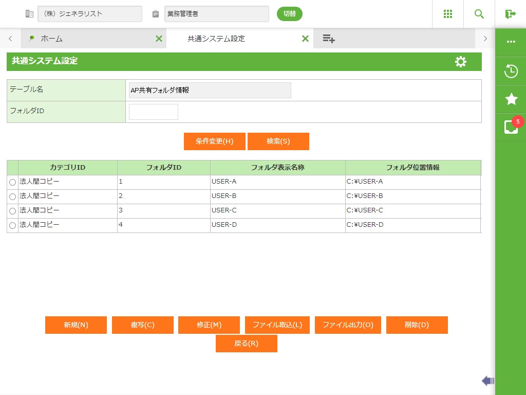 「1.2.23 法人間コピー」でCSVファイルを取込/出力するアプリケーションサーバ上のフォルダを指定します。