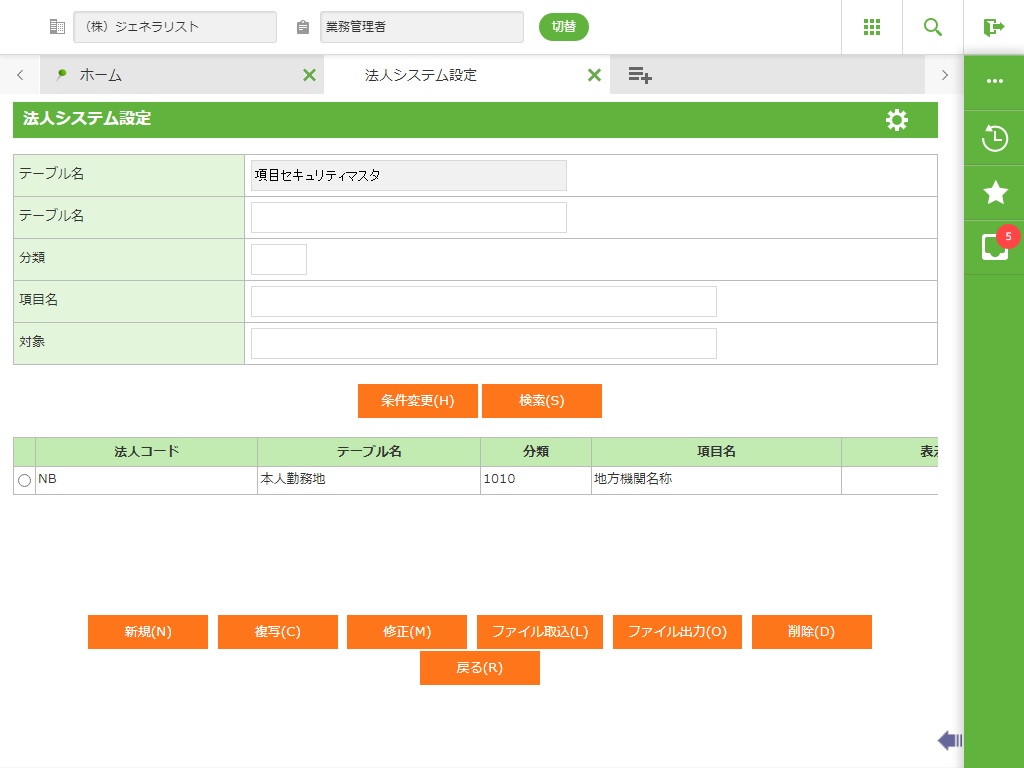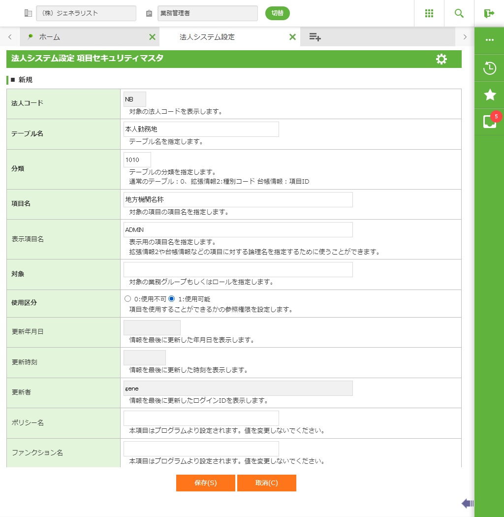 項目セキュリティマスタを新規登録します。詳細画面が表示されます。 |