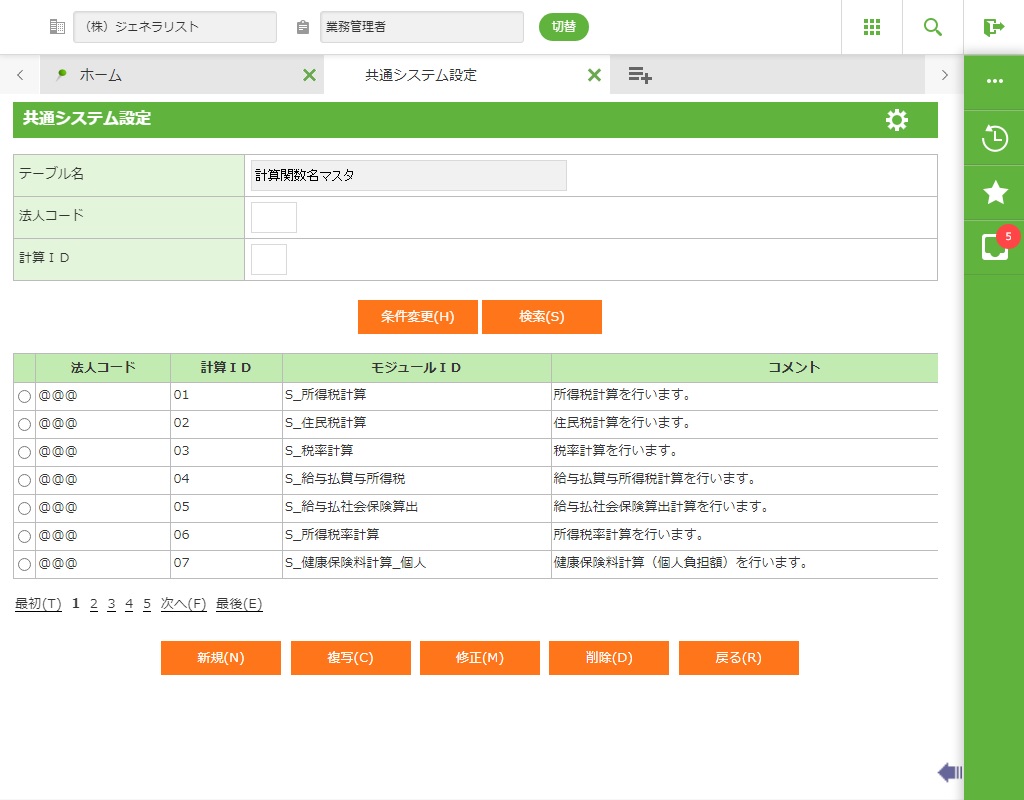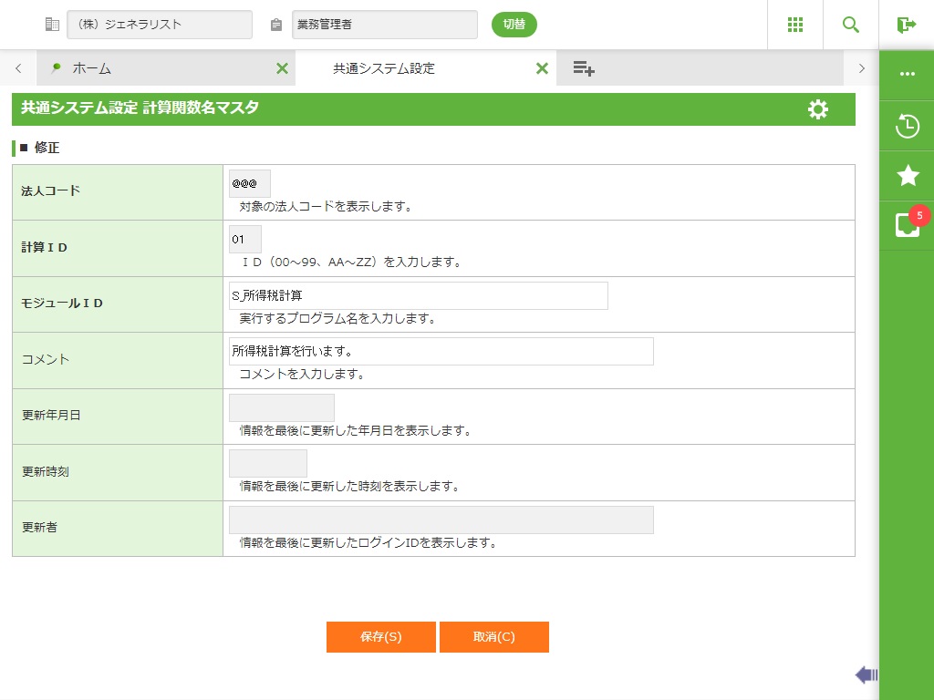 法人コード/計算ID/モジュールID/コメント |