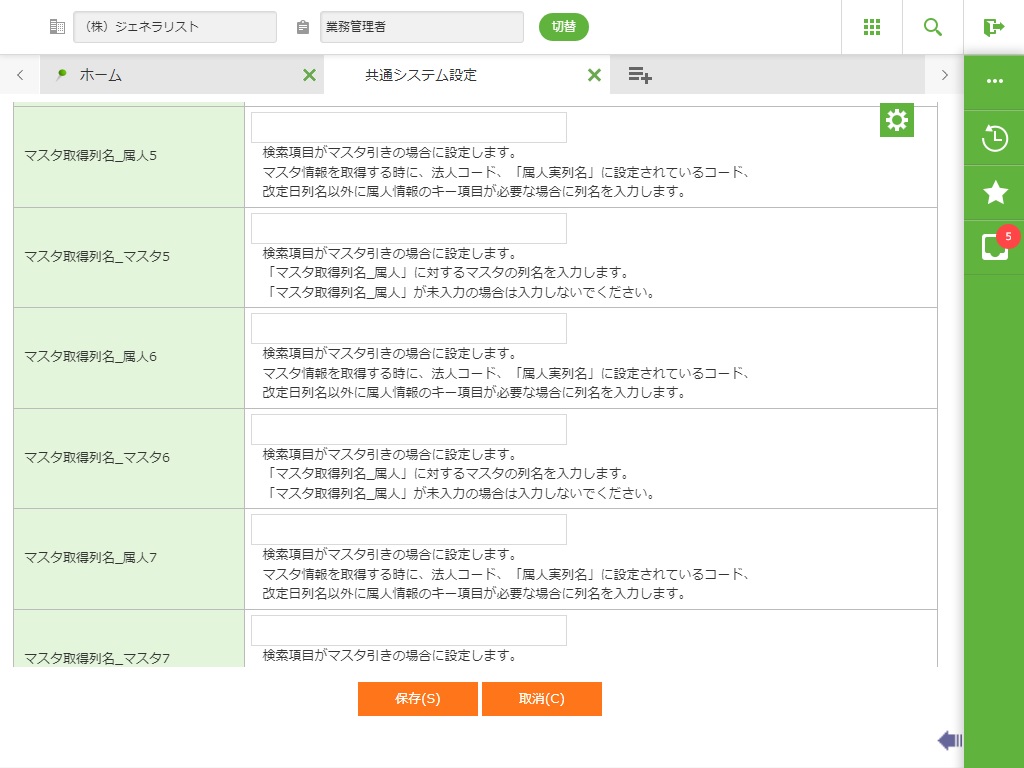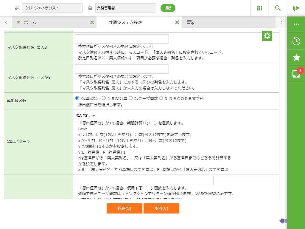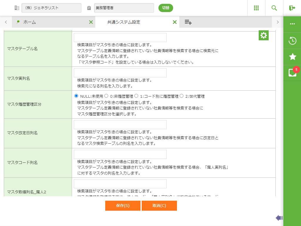 検索項目がマスタ引きの場合に設定します。 PM_Hx_Sy Hxは法人コードの有無を設定します。 Syはマスタの履歴管理方式を設定します。 検索項目がマスタ引きではない場合は「指定なし」を選択してください。 |