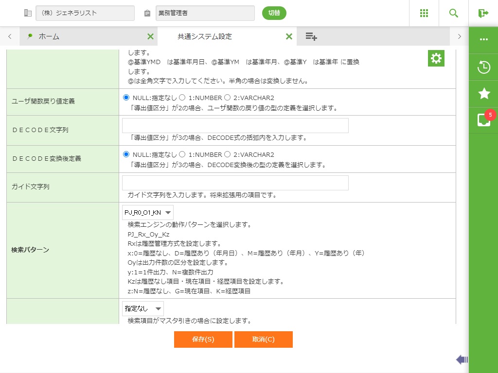 検索エンジンの動作パターンを選択します。 PJ_Rx_Oy_Kz Rxは履歴管理方式を設定します。 Oyは出力件数の区分を設定します。 Kzは履歴なし項目・現在項目・経歴項目を設定します。 |