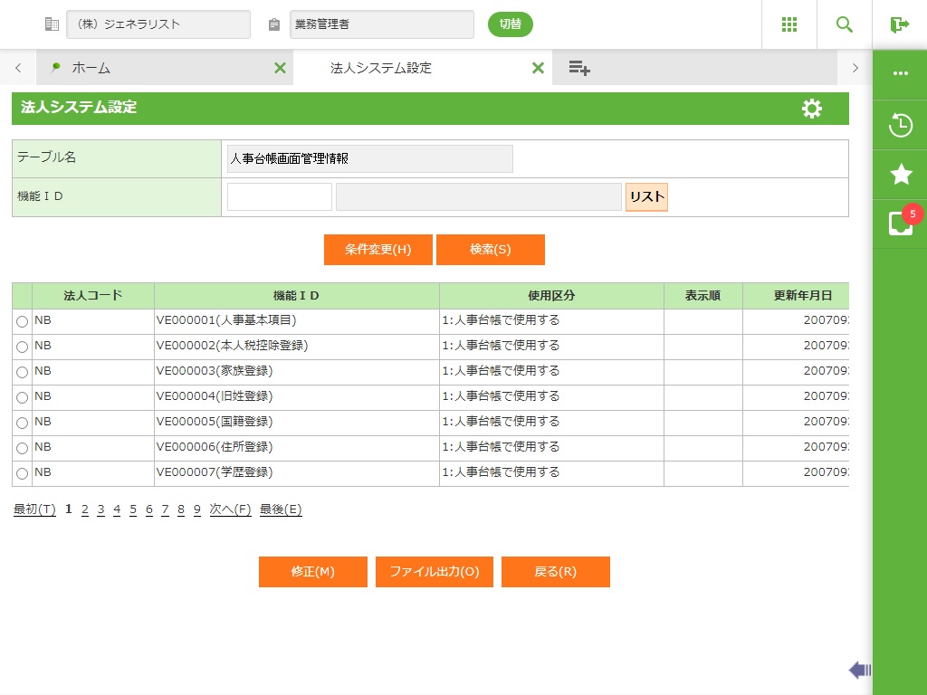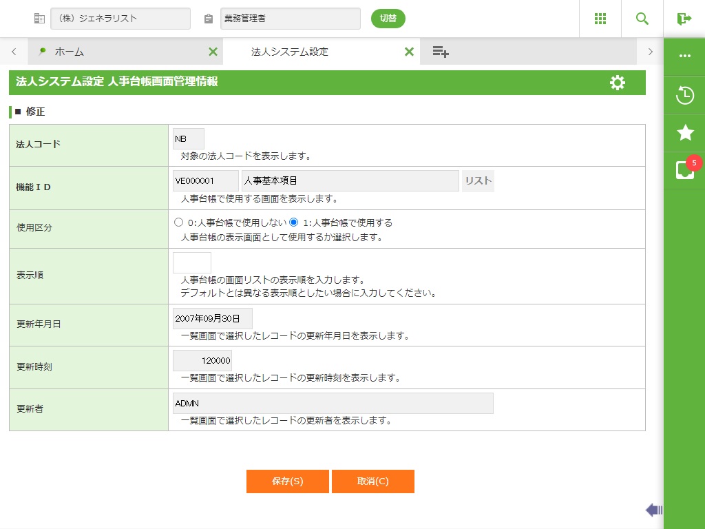 人事台帳の画面リストの表示順を入力します。 |