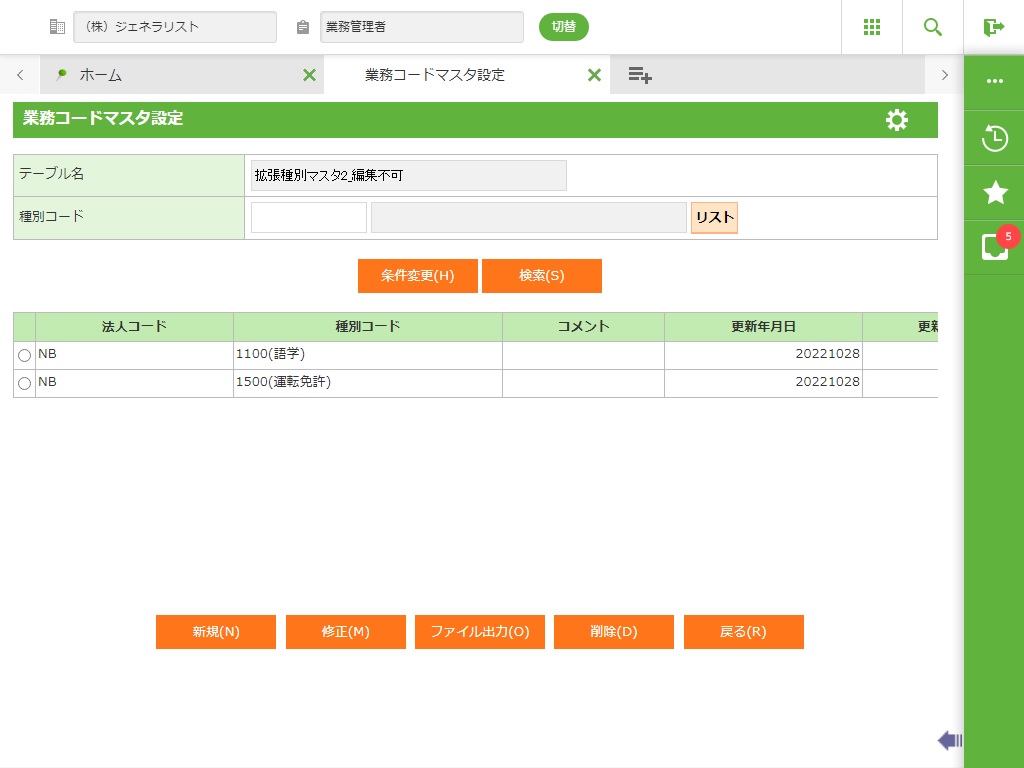 拡張種別マスタ2_編集不可を新規登録します。詳細画面が表示されます。 |