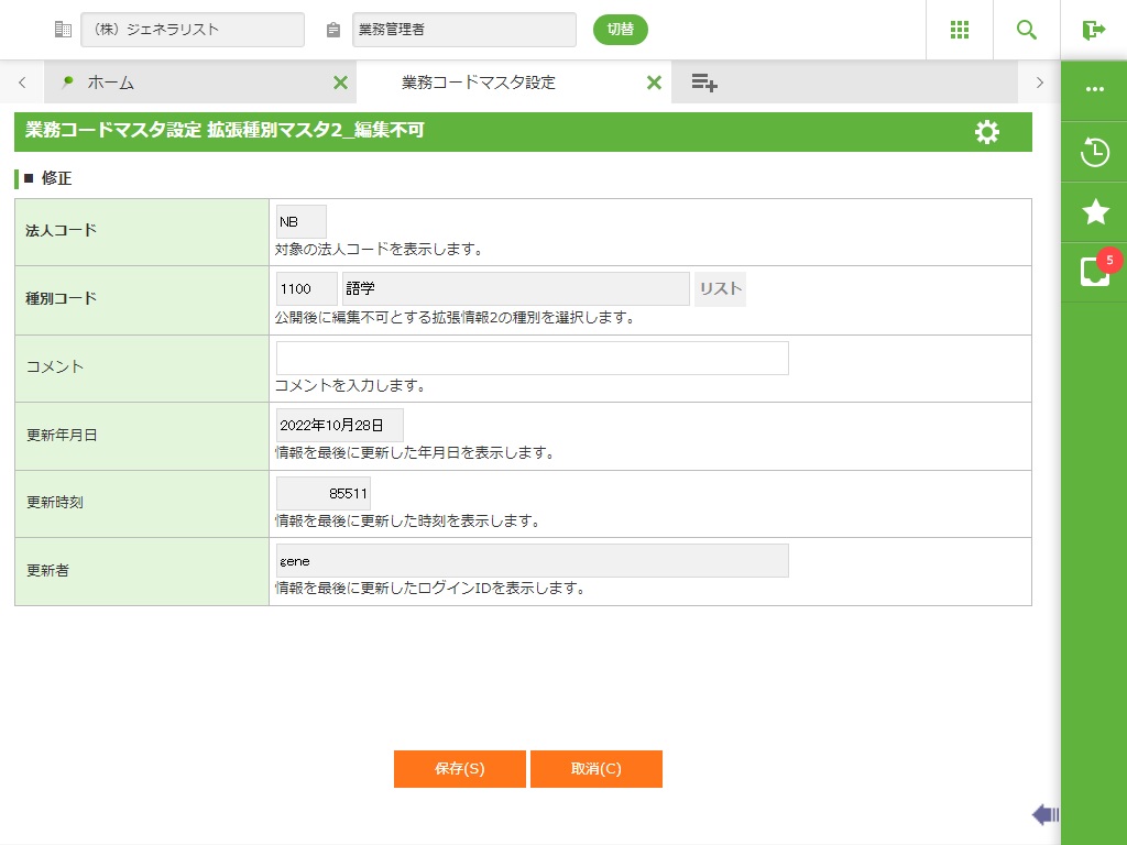 ・ 新規登録時は、以下の項目に入力します。修正時は、指定した拡張種別マスタ2_編集不可の情報が表示されますので、必要な情報を修正します。内容を確認して<保存(S)>をクリックします。