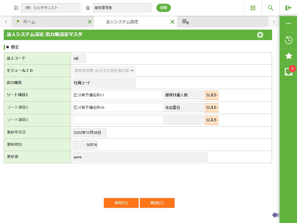 ・ 出力順設定マスタで設定しているソート項目が現在処理年月マスタより削除された場合、出力順設定マスタは更新されません。印刷/ファイル出力を実行時には登録されている出力順パラメータでソート順を決定し、出力を行います。