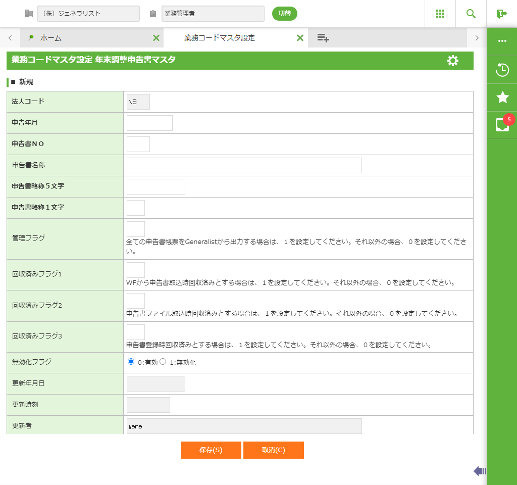・ 新規登録時は、各項目に入力します。修正時は、指定したレコードの情報を表示しますので、必要な情報を修正します。無効/有効化時は、指定したレコードの情報を表示しますが、入力はできません。内容を確認して<保存(S)>をクリックします。