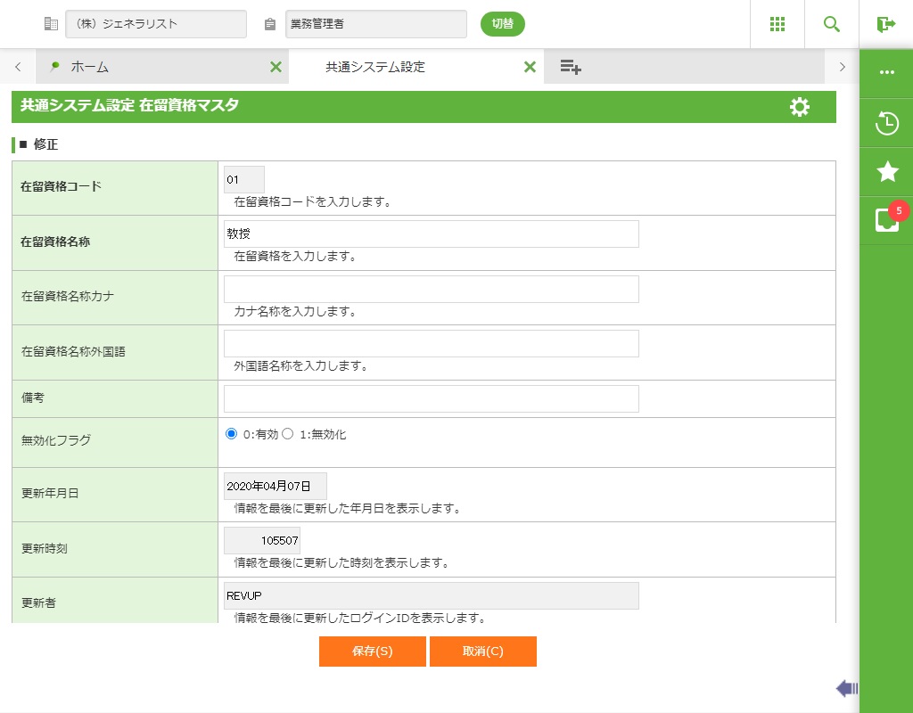 ・ 新規登録時は、以下の項目に入力します。修正時は、指定した在留資格コードの情報を表示しますので、必要な情報を修正します。無効/有効化時は、指定した在留資格コードの情報を表示しますが、入力はできません。内容を確認して<保存>をクリックします。