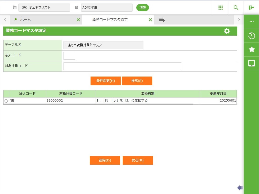 選択した口座カナ変換対象外マスタを削除します。 |