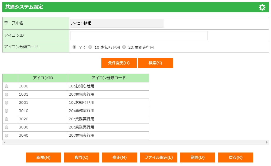 | アイコン分類コード | アイコン分類コード(全て/10:お知らせ用/20:業務実行用)を選択します。 | オプションボタン選択 | ||