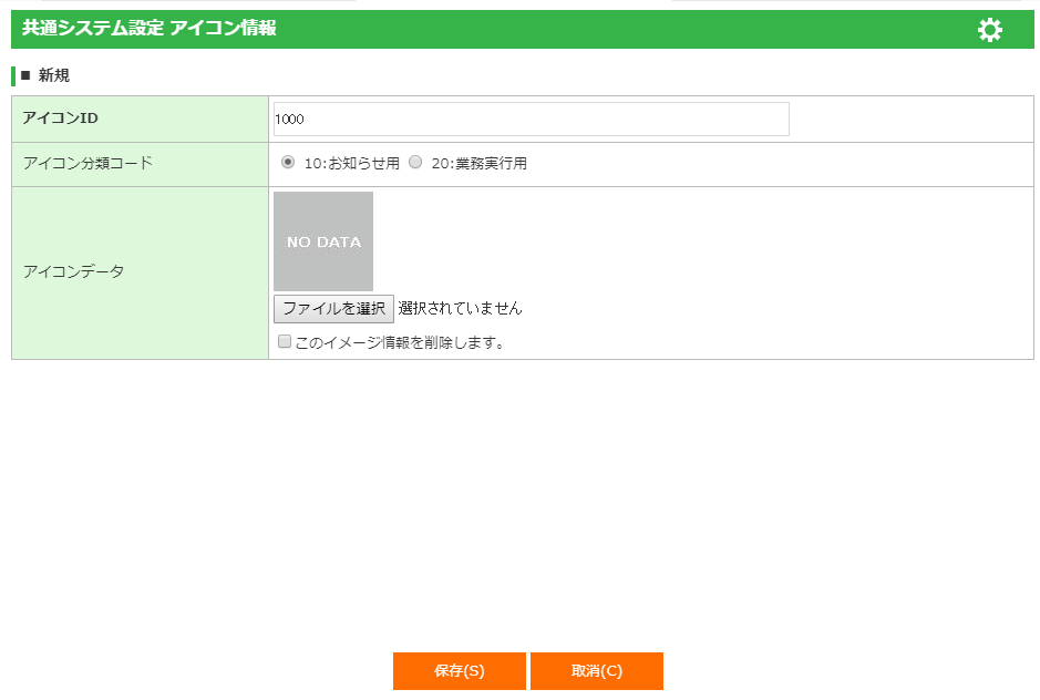 | アイコン分類コード | アイコン分類コード(10:お知らせ用/20:業務実行用)を選択します。 | オプションボタン選択 | ||