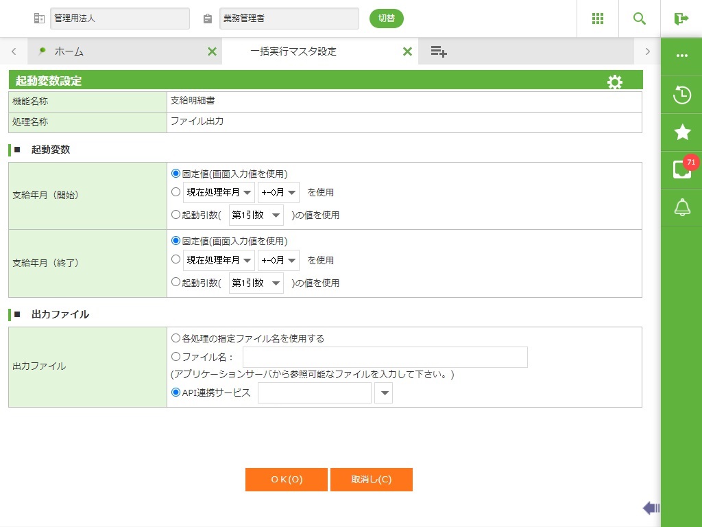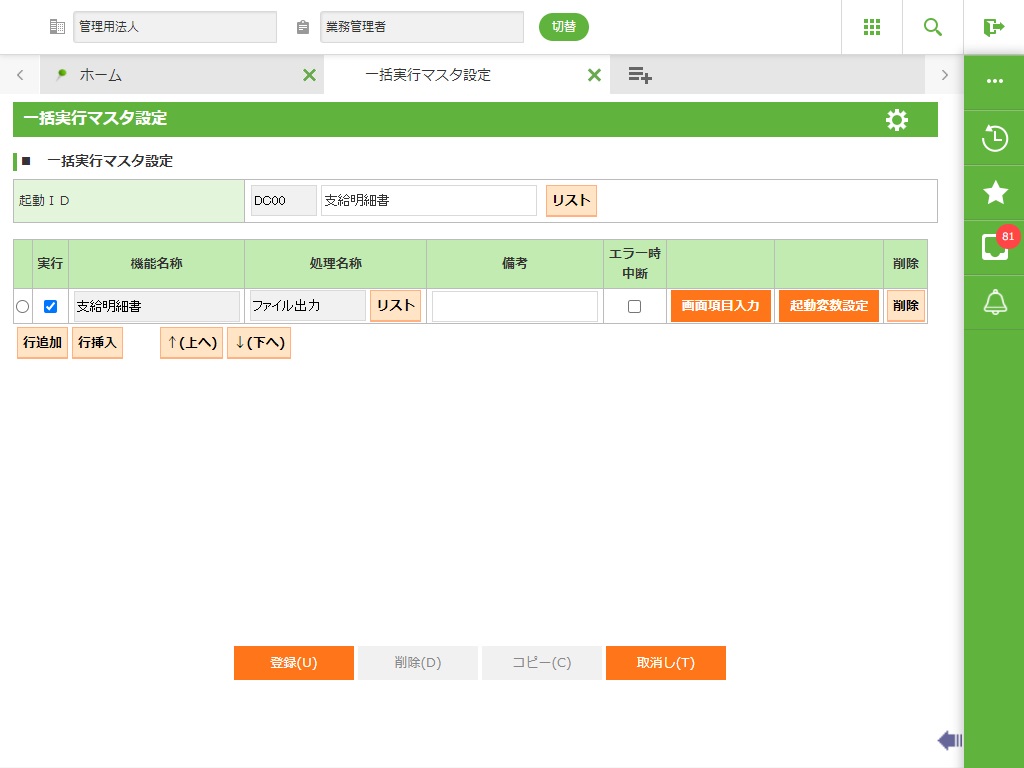 0:一括実行マスタ設定は、ログイン法人以外の法人で登録した起動IDは参照できません。 |