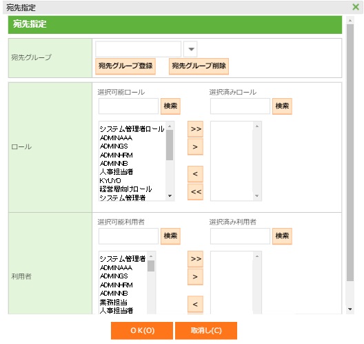 選択可能な利用者の一覧を表示します。 >>で選択可能利用者を全て選択します。 >で個々に選択可能利用者を選択します。 |