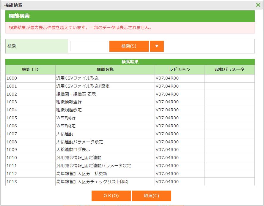 検索する機能IDまたは機能名称またはレビジョンを入力します。 |