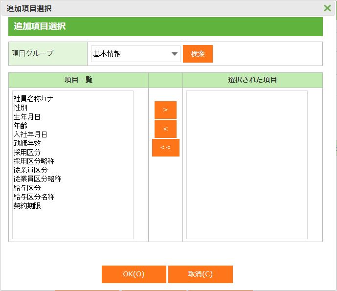 追加が可能な項目を表示します。 挿入:検索項目を追加する場合は、追加する項目を選択し「>」ボタンを押下、もしくはダブルクリックすることにより選択された項目に追加されます。 |