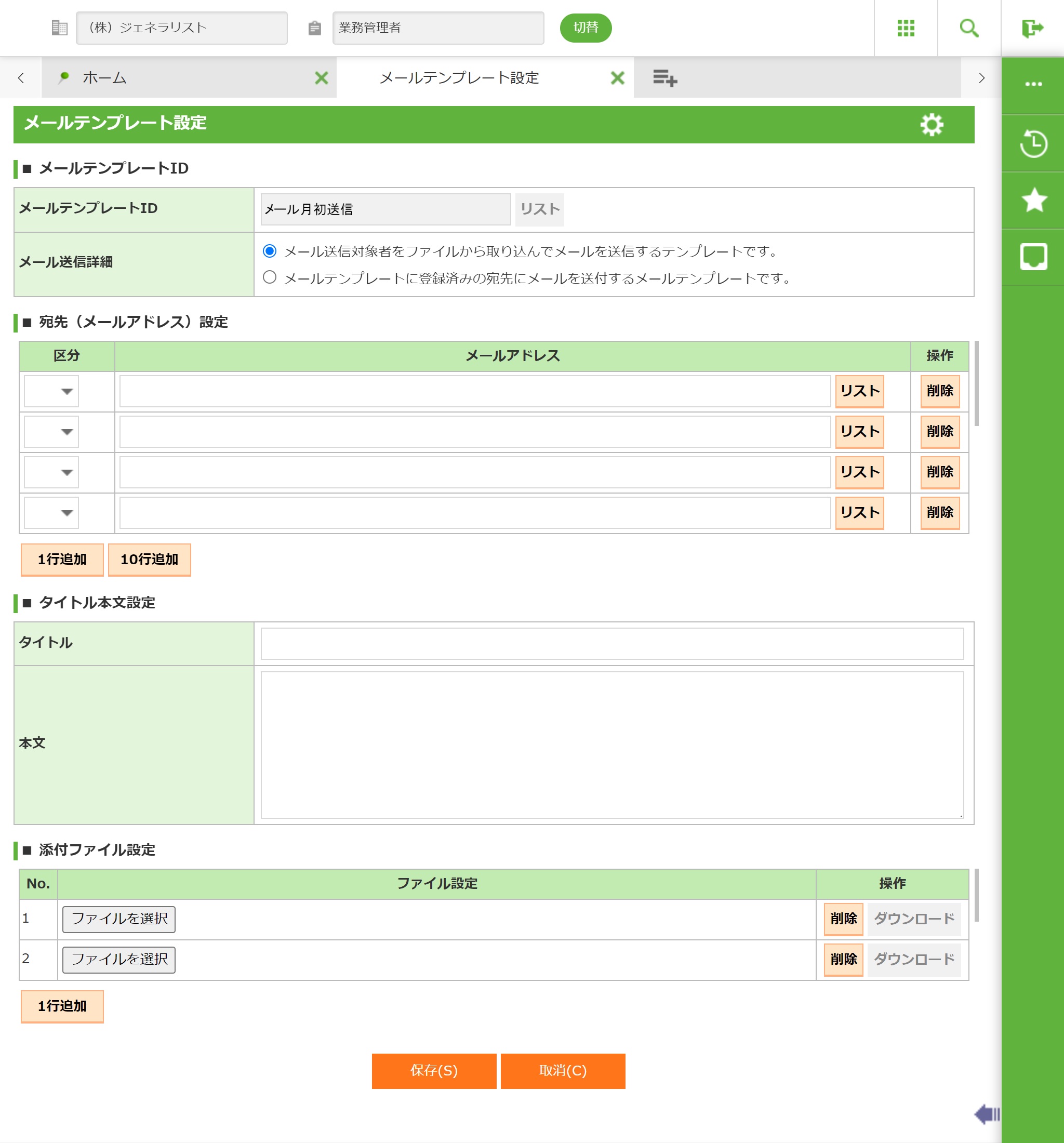 個人向けメール送信(1.2.45)、定型メール送信(1.2.46)にて使用するメールテンプレートを編集することができます。