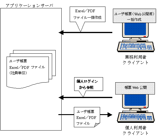 - 本機能でユーザ帳票のExcelまたはPDFファイルを一括作成します。作成したファイルは、アプリケーションサーバ上に作成またはデータベースのテーブルに保存します。作成したユーザ帳票は、個人利用者IDでログインすることで、1.3.5 帳票Web公開から参照することができます。以下の図に、本機能の概要を示します。