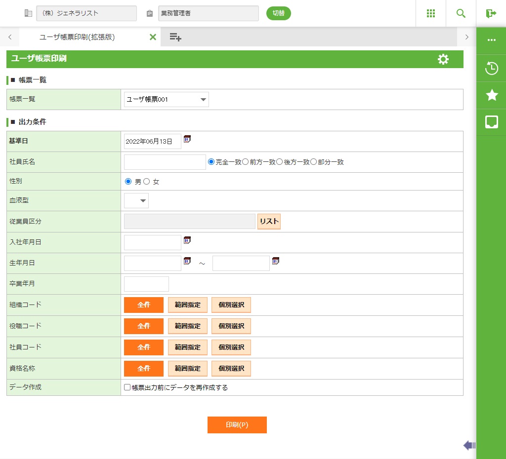 帳票を指定して印刷します。ユーザ帳票条件設定にて設定された検索項目に条件を指定して印刷することができます。