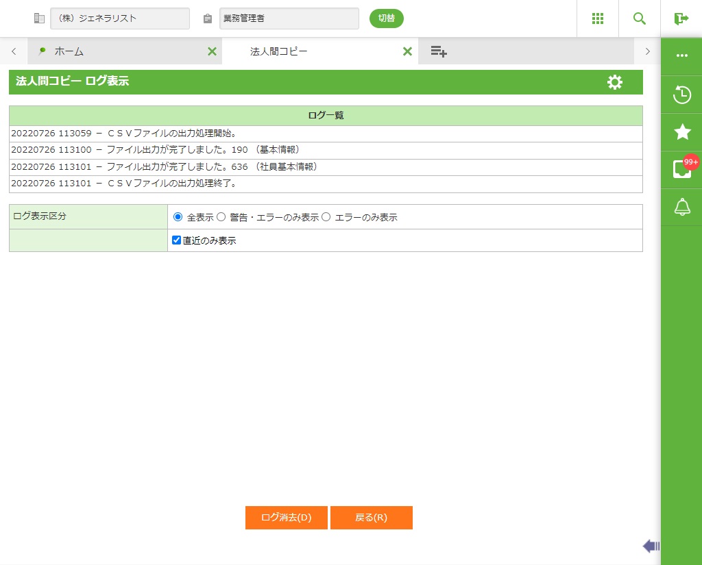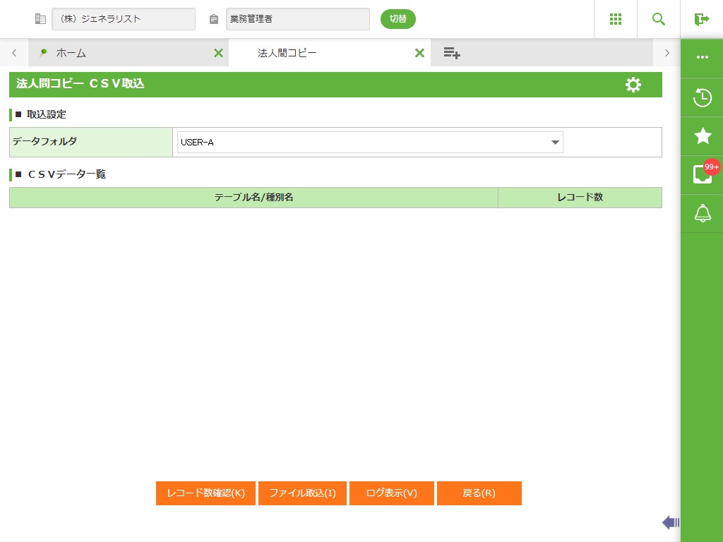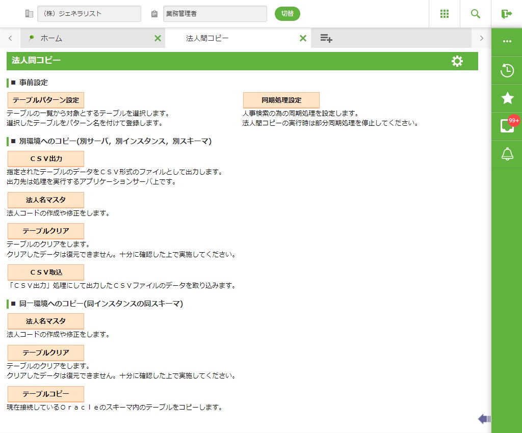 ・ 法人間コピー機能はGeneralistの主要なデータに直接アクセスする機能です。稼動中のシステム運用中にコピー処理や取込処理、および削除処理は行わないでください。