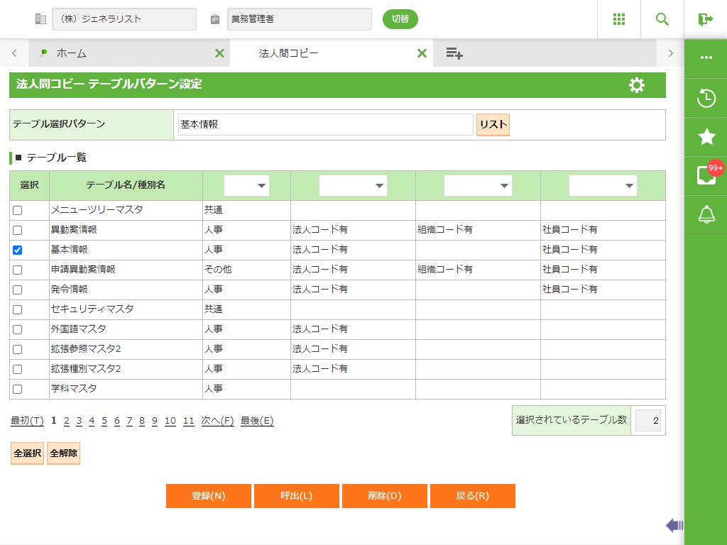 法人間コピーは処理対象(テーブルコピー、CSV出力、テーブルクリア)のテーブルをパターンとして登録することができます。