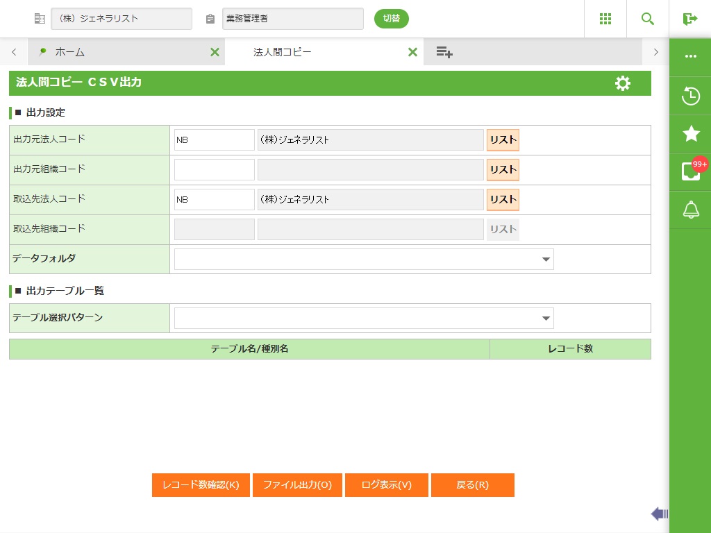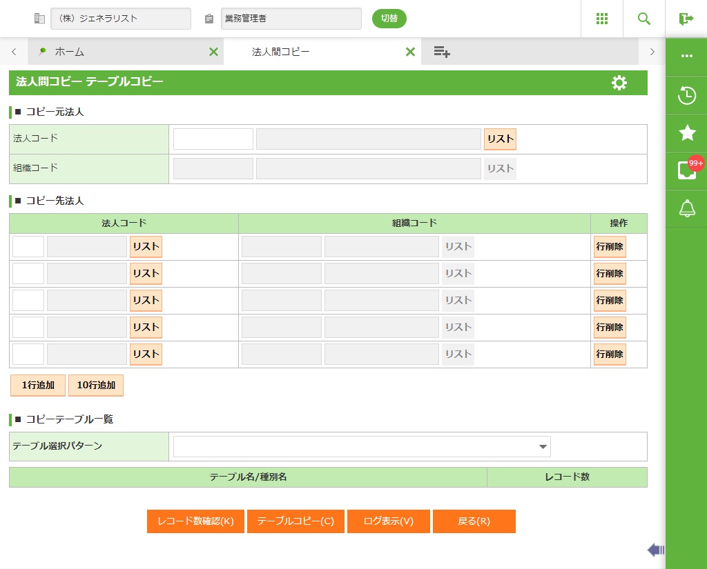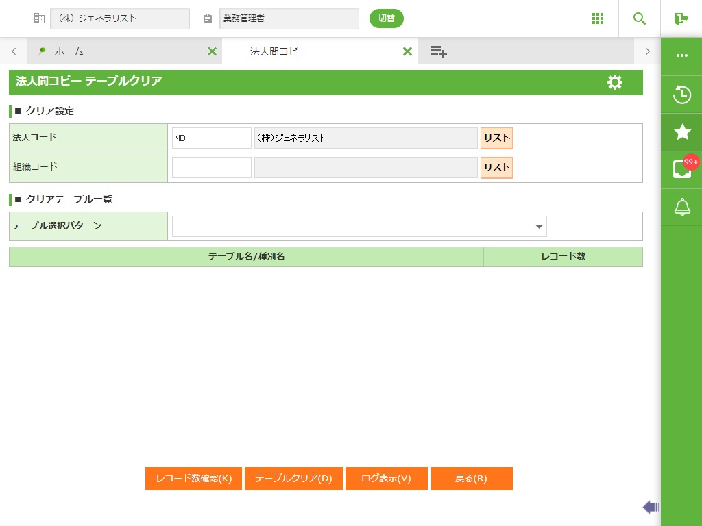 法人間コピーの[テーブルクリア]より、法人名マスタで作成されたマスタの初期値を削除します。(この後にファイル取込を行うことを前提としています。)