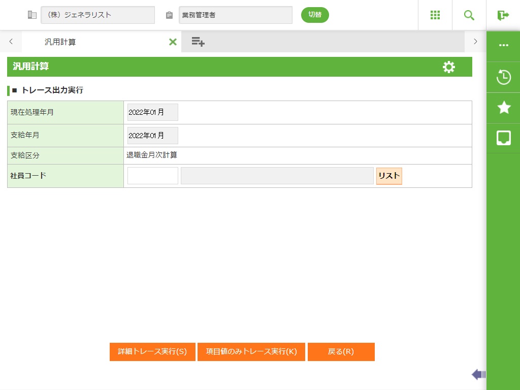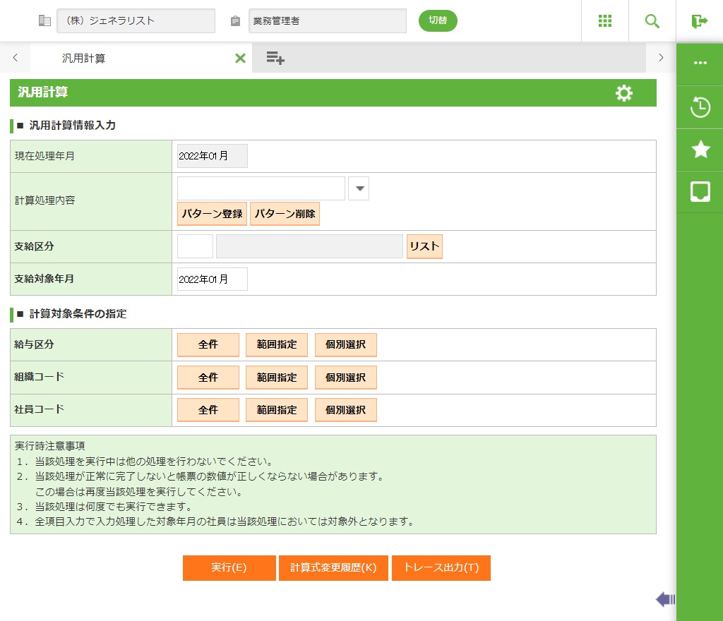 汎用計算処理では、計算パターンの登録やトレース機能の実行が出来ます。