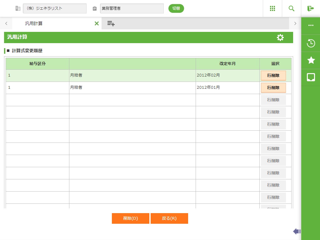汎用計算を中止し、画面-1に戻ります。 変動項目の削除処理を実行しない場合は、計算式変更履歴画面(画面−4)参照にて改定年月を削除後、給与計算を実行してください。 |