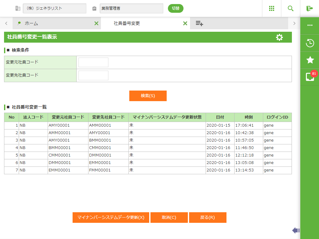 - 法人内でのみ社員番号の変更が行えます。別法人の場合は、社員情報コピーをご利用ください。