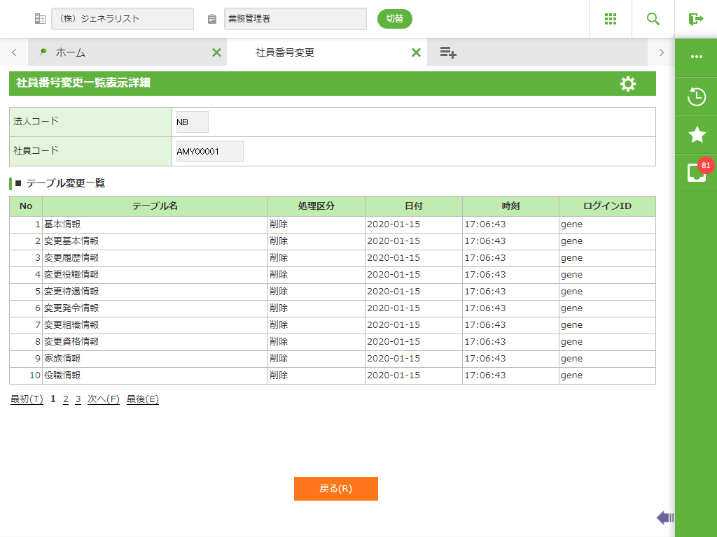 | 一覧 | 選択した社員コードのデータが変更されたテーブルの一覧を表示します。 | 表示項目 | ||
