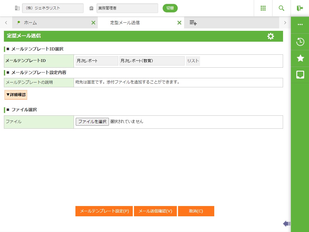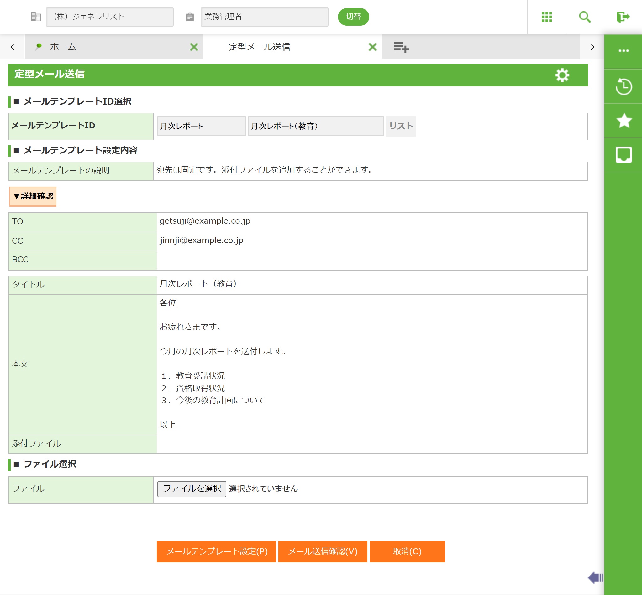 事前にメールテンプレート設定(1.2.47)に設定した宛先にメールを送信することができます。
