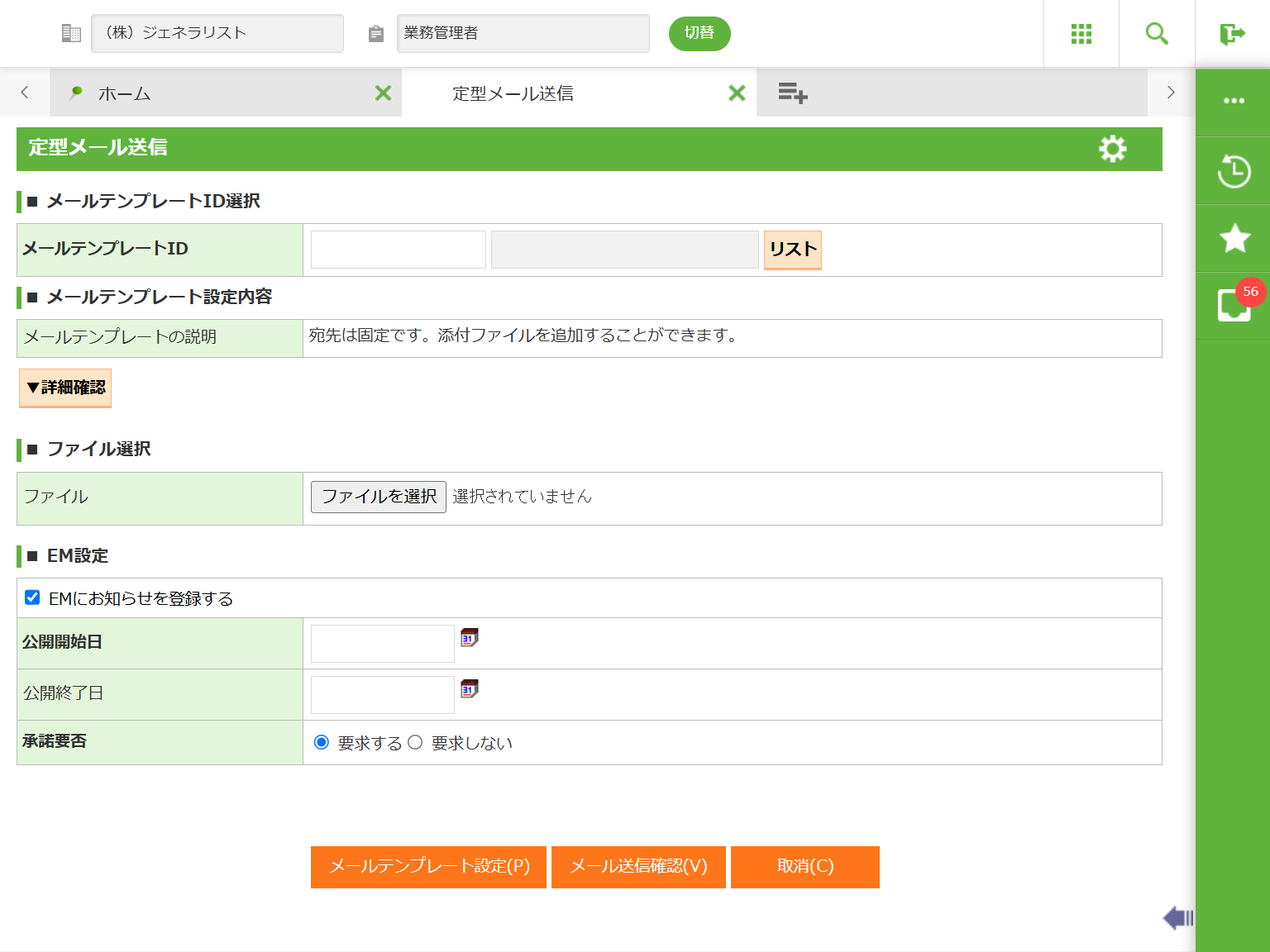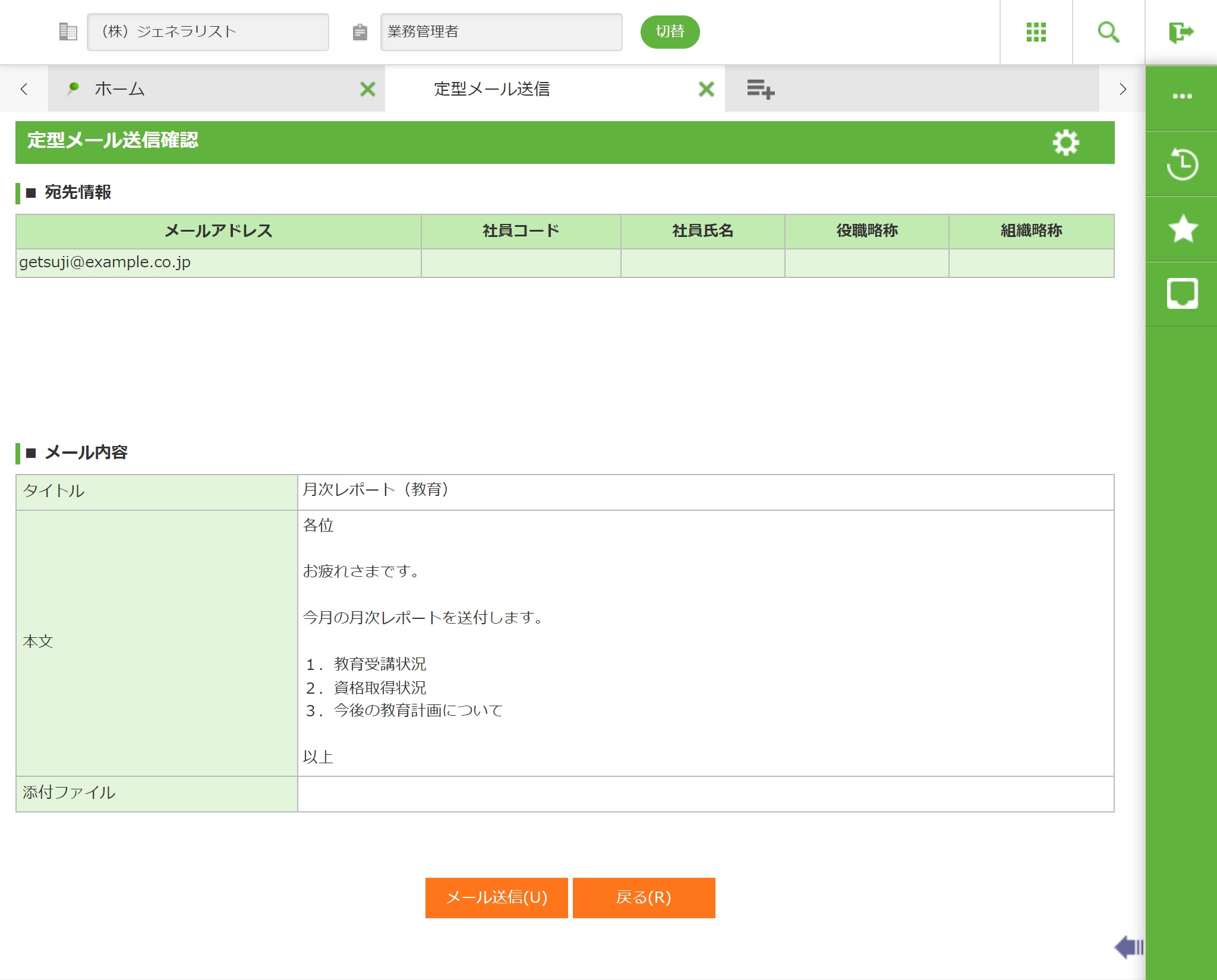 メールテンプレート設定(1.2.47)で設定した特定の従業員向けにお知らせなどのメールを配信します。