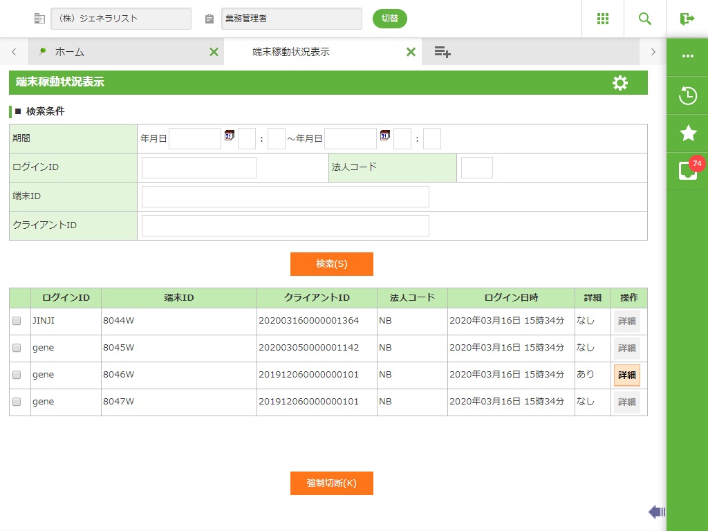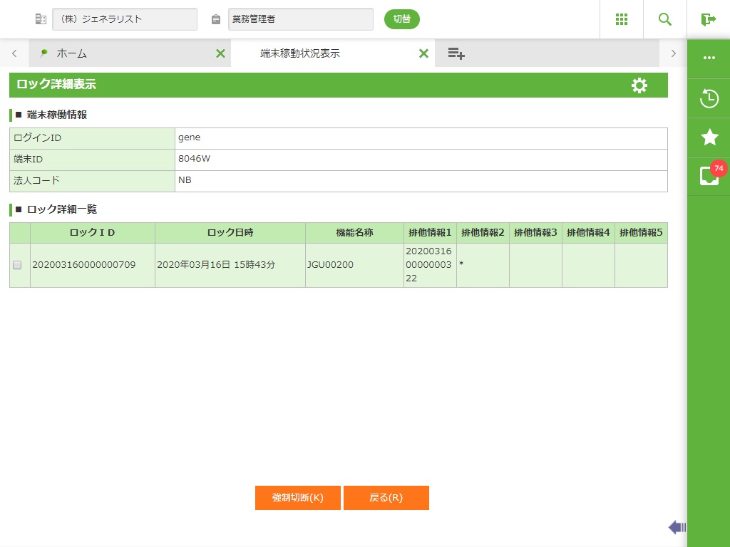 端末稼動状況および機能のロック情報の確認が行えます。また、ロックがかかった機能を強制切断することができます。