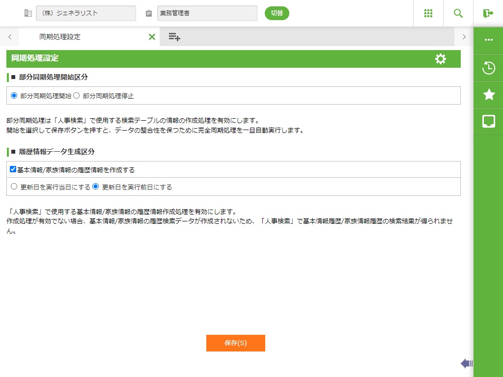 その後再度、選択した状態に変更して、設定を保存すると、履歴情報が存在しない社員に対して、履歴情報を一括で作成する処理が起動します。