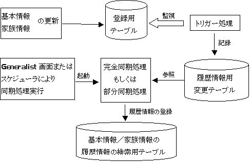 ・ 基本情報/家族情報が登録/変更/削除されると、対象社員の情報を履歴情報用の変更テーブルに保存します。「同期処理実行(2.6.8)」の完全同期処理、もしくは部分同期処理を実行した際に、履歴情報用の変更テーブルを参照し、基本情報/家族情報の履歴情報の検索用テーブルに履歴情報を登録します。このとき、登録されているデータに変更があった社員の情報のみを検索用テーブルに登録します。データに変更がない社員の情報(更新年月日のみ変更された場合など)は対象外です。