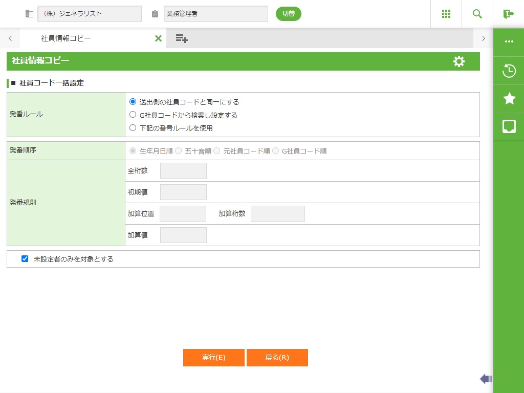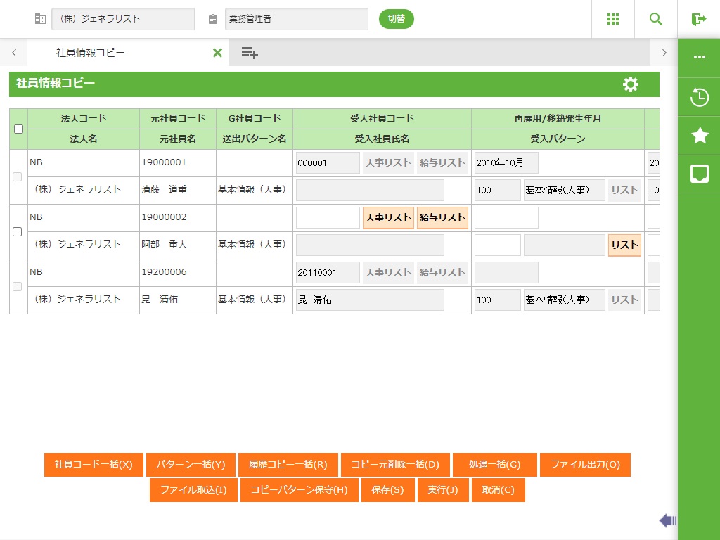 1) 「社員情報コピー」を行い、必要な情報を選択し、新しい社員コードを発番します。