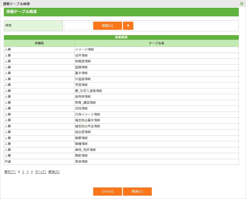 連動対象に指定できるテーブル名を表示します。拡張情報2の場合、種別名も表示します。 |