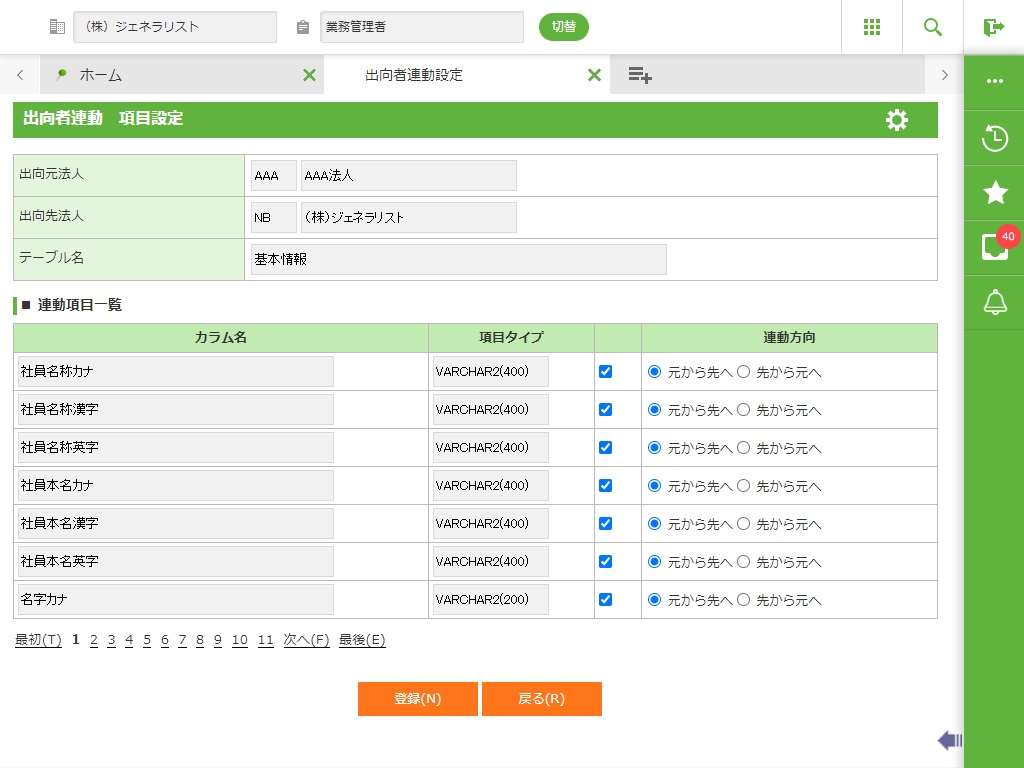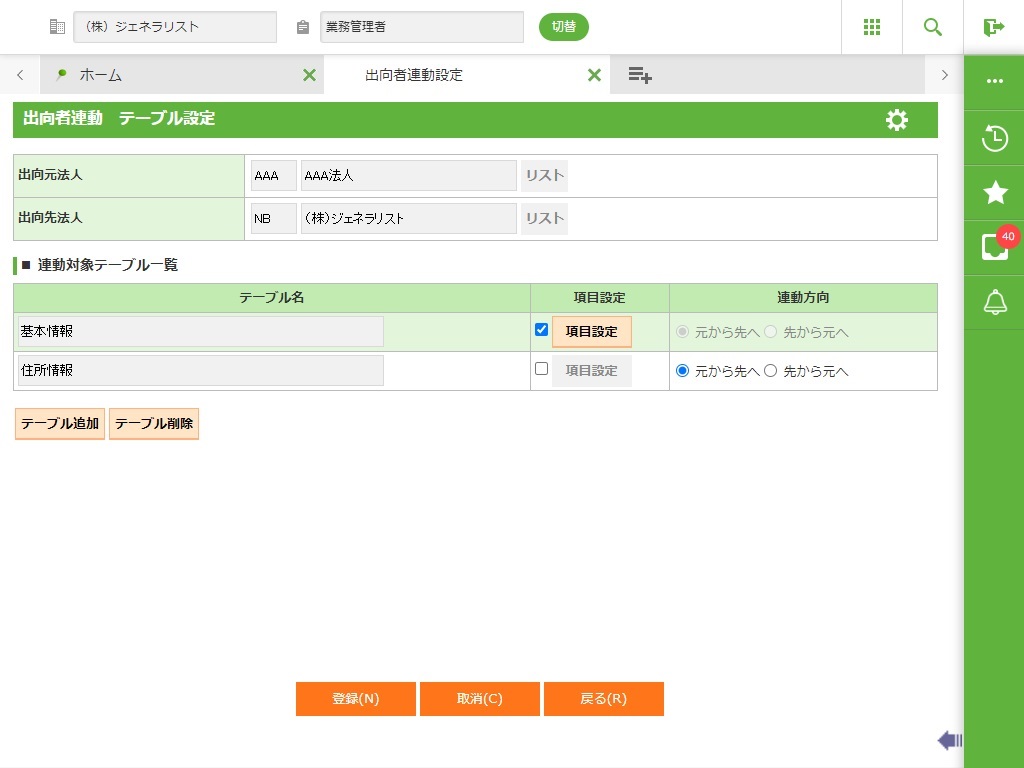 出向社員の各個人情報に関して、出向元・出向先でのデータ更新を双方向で更新するための対象法人、テーブル、項目を設定します。