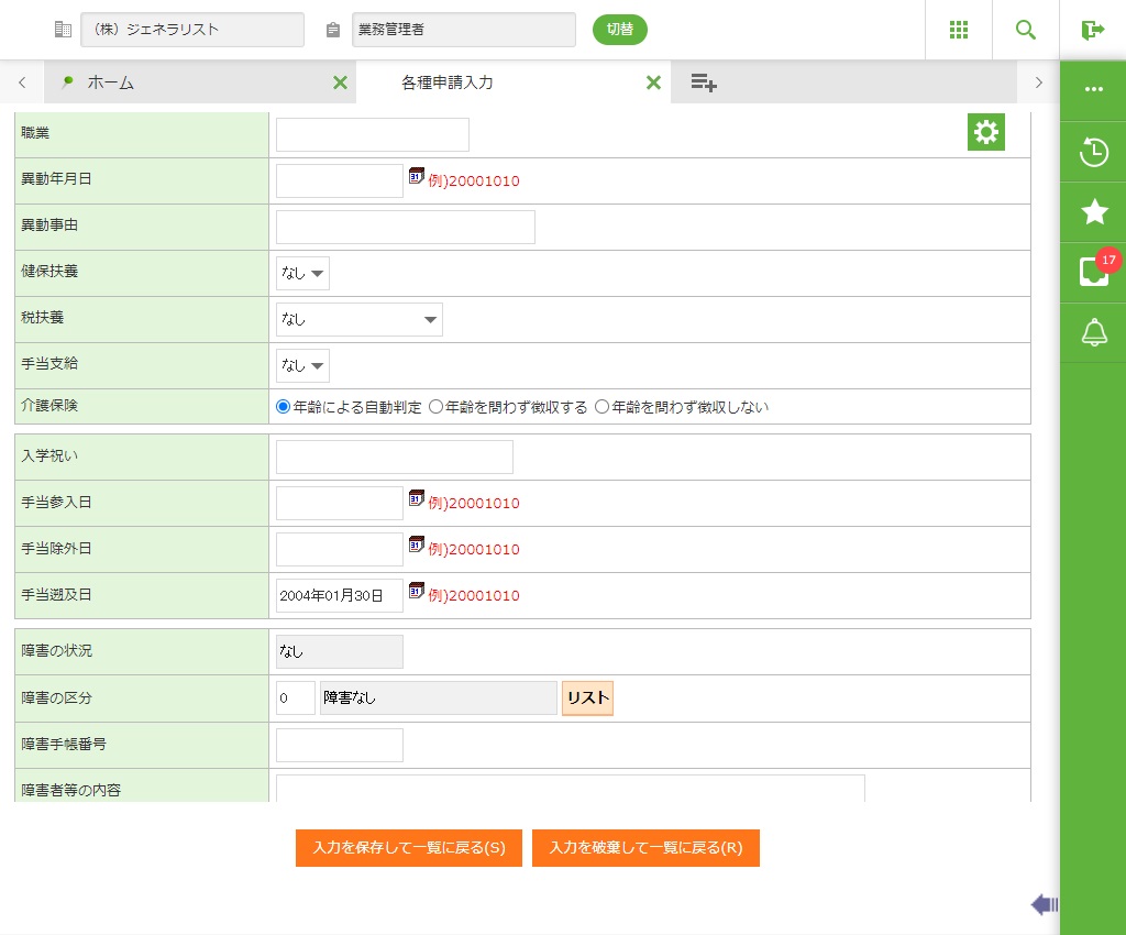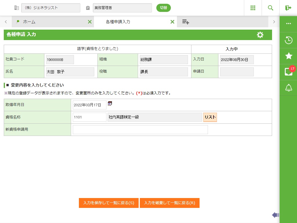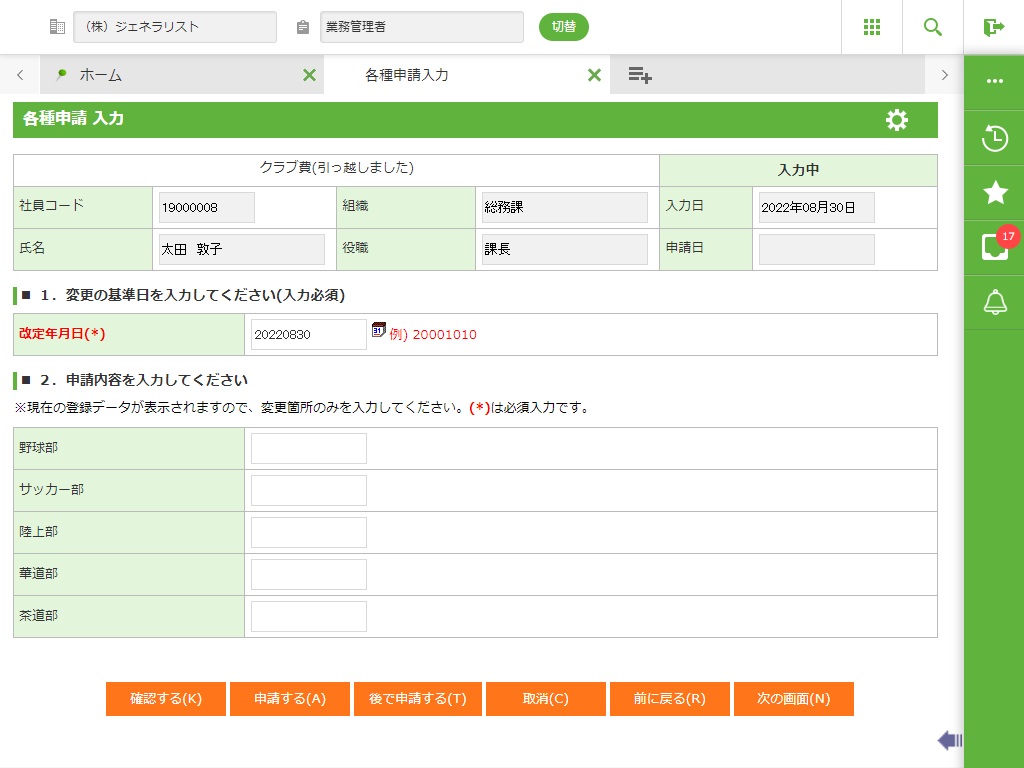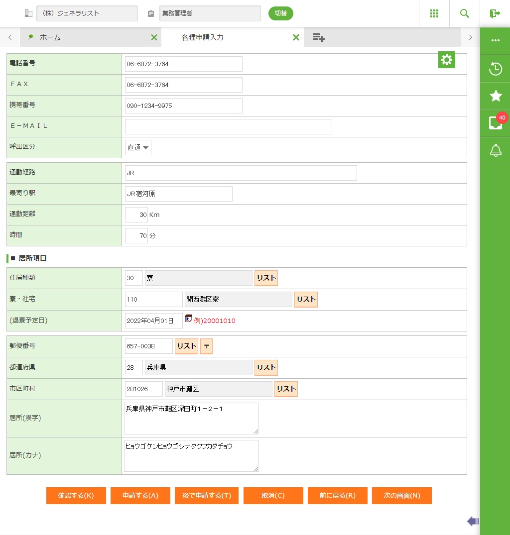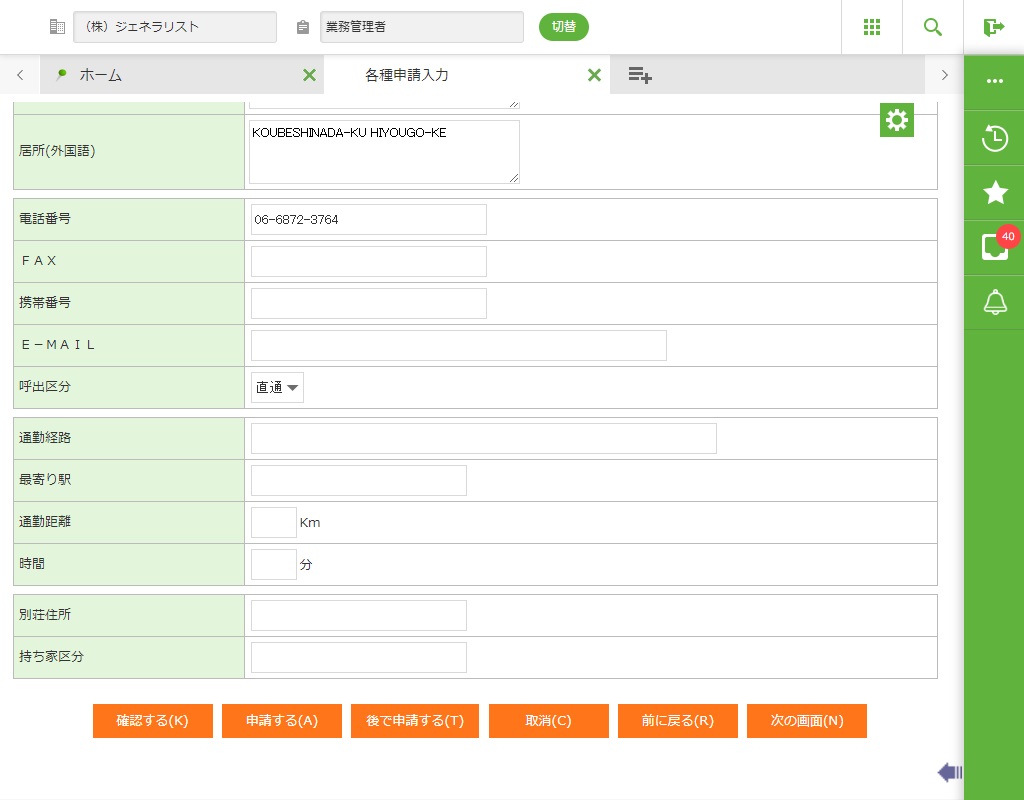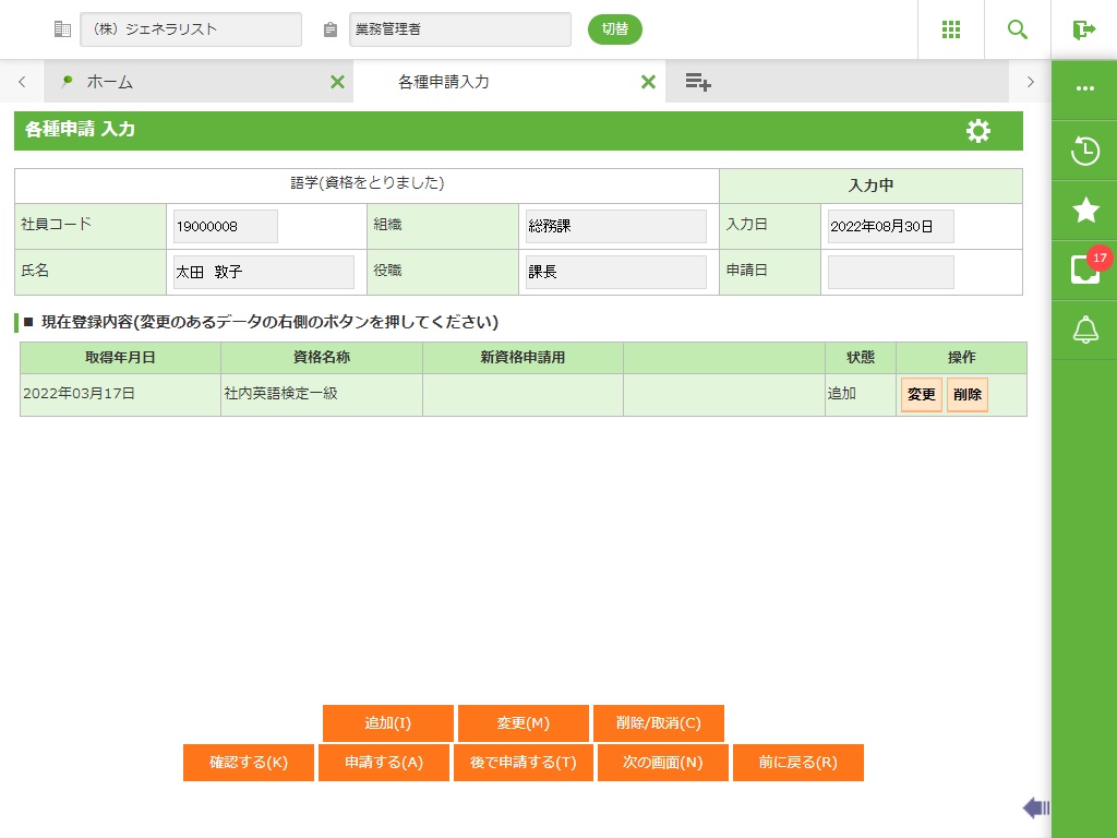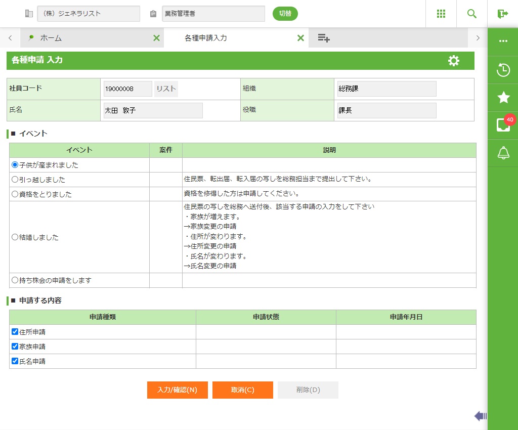 人事管理部門のオペレータが、社員より提出された各種申請内容の入力を行います。