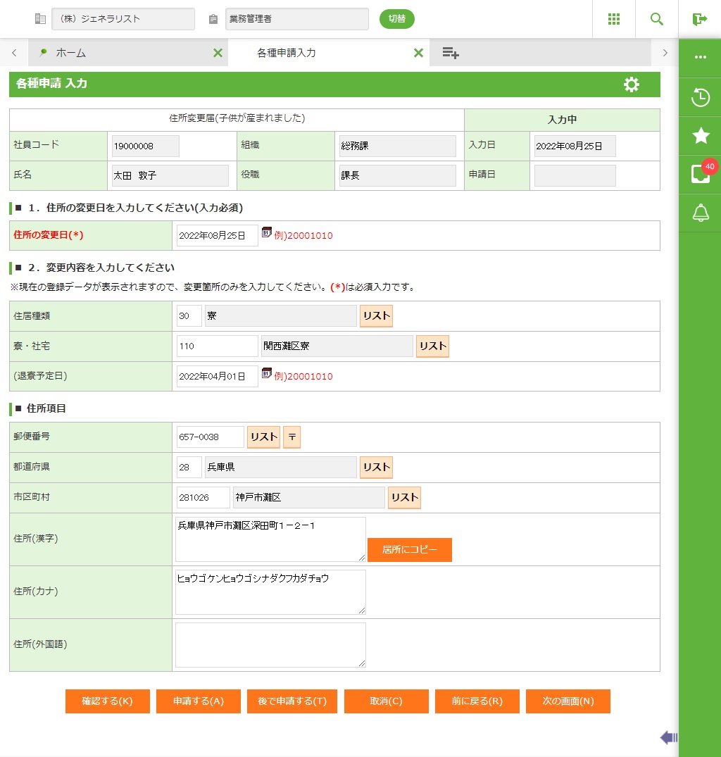 2.5.2.1 各種申請入力画面/ 2.5.2.2 申請入力(住所変更)画面/ 2.5.2.3 申請入力(家族変更)一覧画面/ 2.5.2.4 申請入力(家族変更)詳細画面/ 2.5.2.5 申請入力(家族変更)画面(本人情報入力画面)/ 2.5.2.6 申請入力(家族変更)収入から登録画面/ 2.5.2.7 申請入力(氏名変更)画面/ 2.5.2.8 拡張情報2(非日付制約管理型申請入力)一覧画面/ 2.5.2.9 拡張情報2(非日付制約管理型申請入力)詳細画面/ 2.5.2.10 拡張情報2(日付履歴管理型申請入力)画面