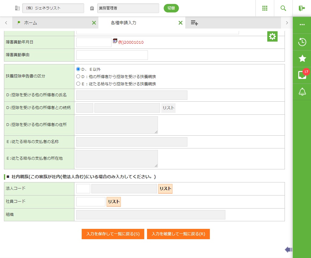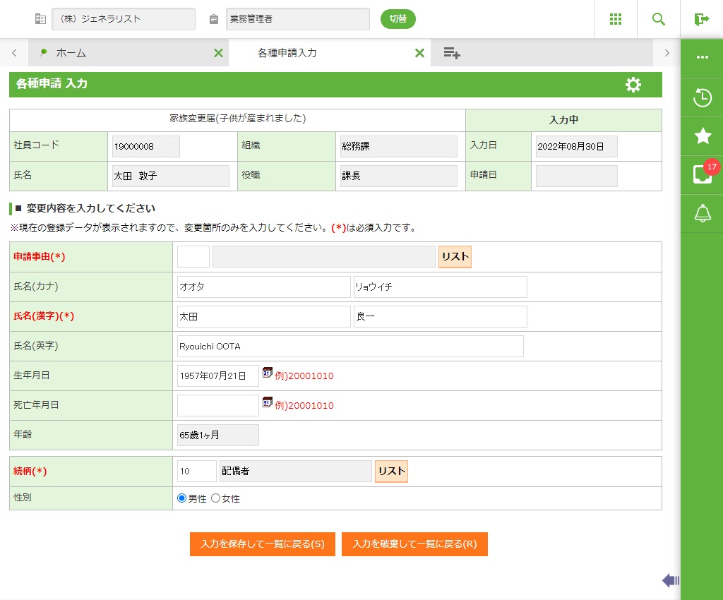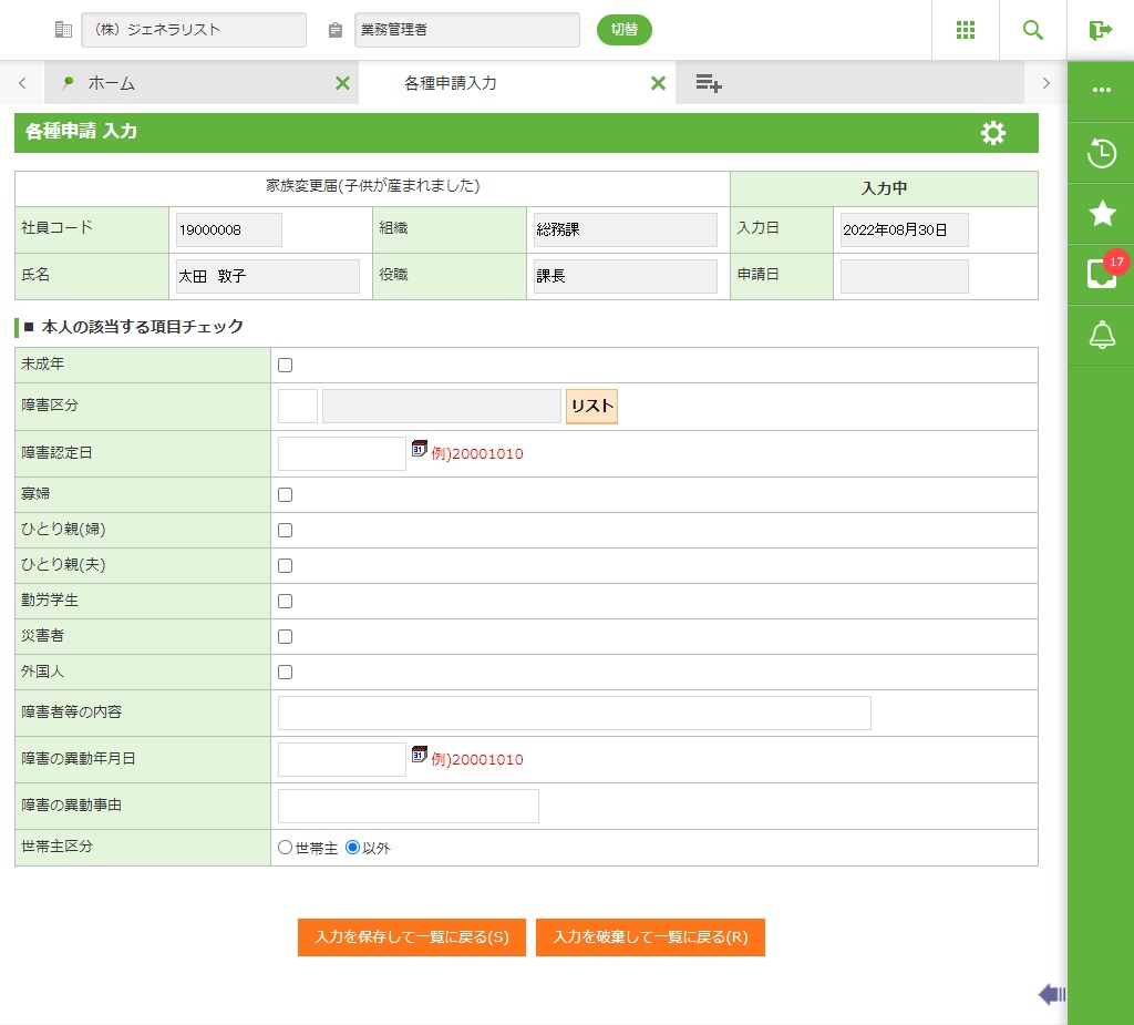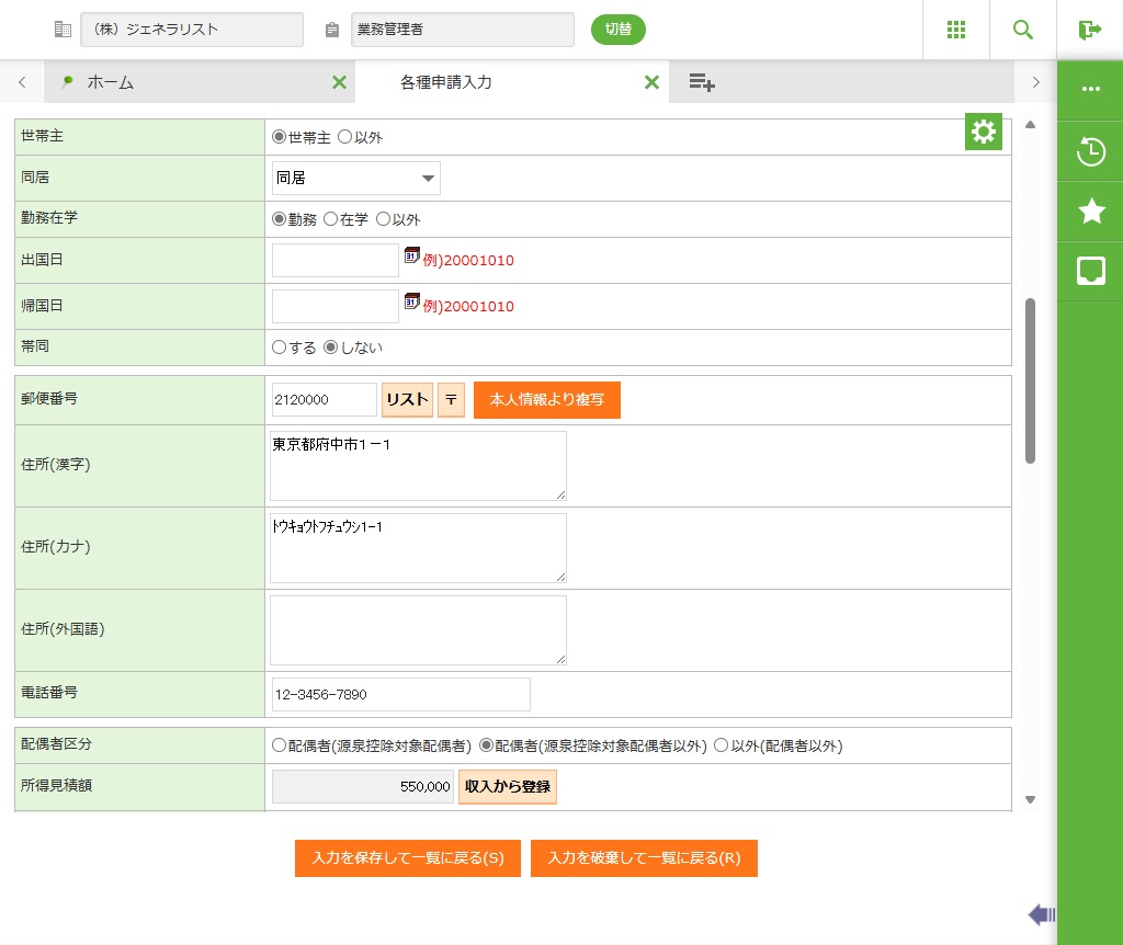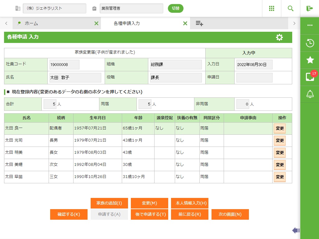 ・ 家族の申請は本機能またはワークフローシステムのどちらかで実施してください。併用した場合、他の機能で個人番号が正しく出力されない可能性があります。
