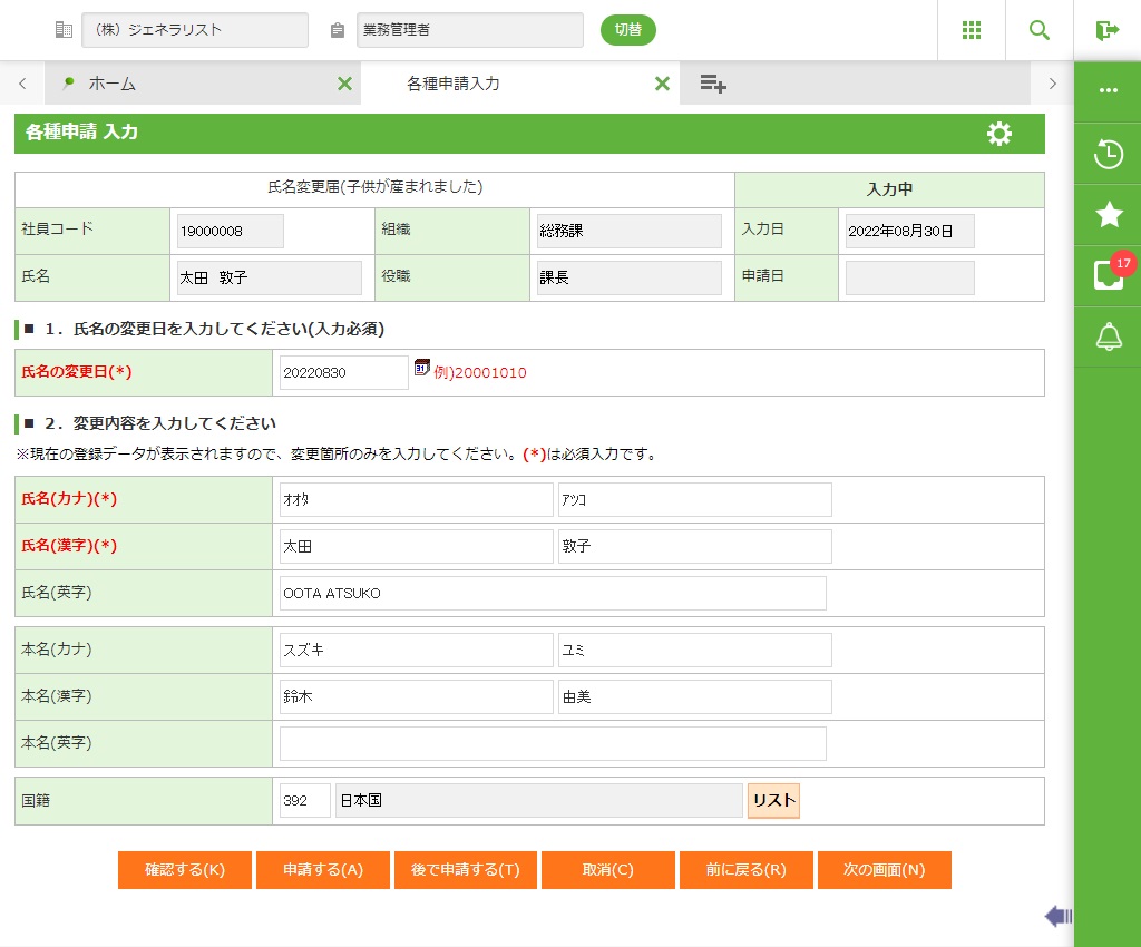 改姓後の本名(カナ)(名)を入力します。承認されると基本情報が更新されます。 |