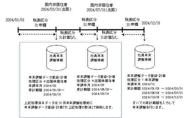 ・ 出国時、社員に源泉徴収票を配布するなど、年度内の出国の都度年末調整を行っている場合でも12月年末調整処理において、国内居住期間に該当する給与・賞与の値をすべて累計して年末調整を行います。