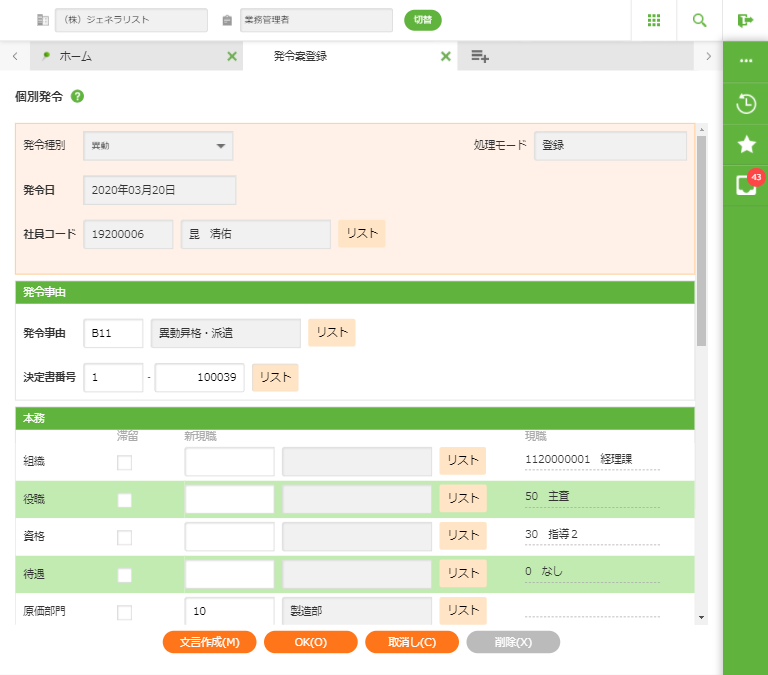 初期表示画面例(発令種別「異動」)