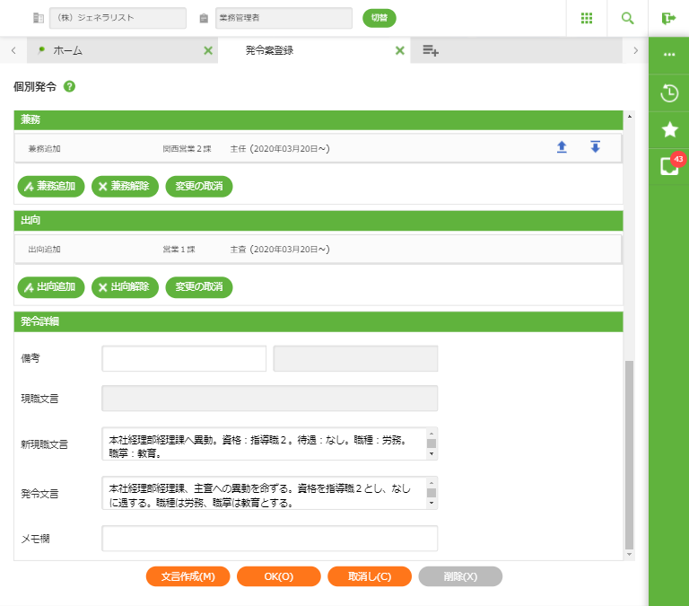 | 文言作成(m) | 現職文言と発令文言を自動生成します。 |