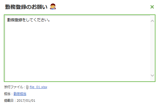 | 添付ファイル | お知らせの添付ファイルを表示します。 リンクをクリックすることでダウンロードできます。 |