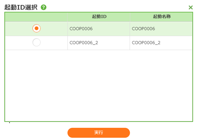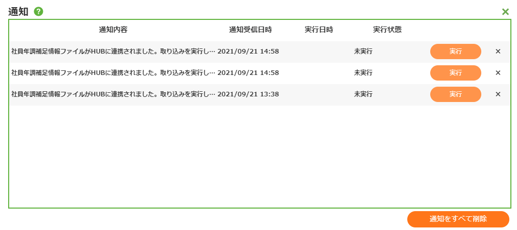 | 実行 | ≪Generalist HUBサービス≫専用のボタンです。実行状態が「未実行」、「異常終了(再試行可能)」の場合のみ、使用できます。 選択した通知に関連する一括実行マスタ設定に登録した機能を実行します。 複数の一括実行マスタ設定があるの場合、起動ID選択画面をポップアップで表示します。 |