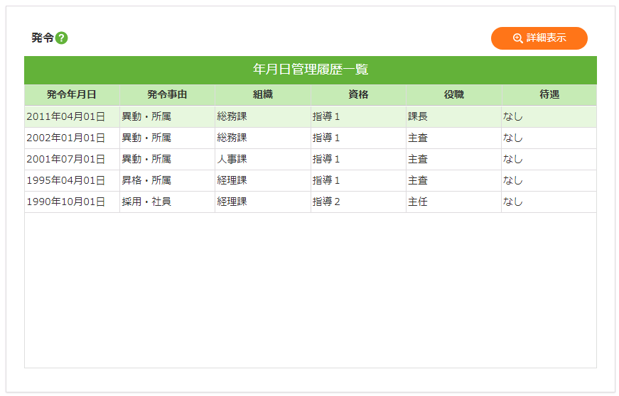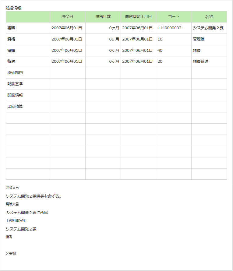 組織、資格、役職、待遇に対応する発令日をそれぞれの項目ごとに表示します。 |
