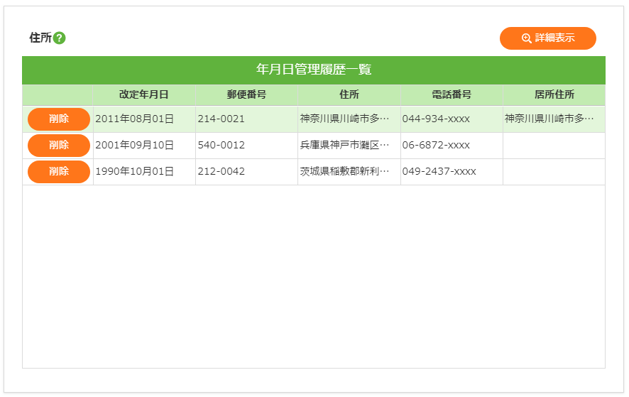 住所登録の履歴を一覧表示します。