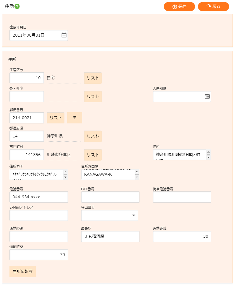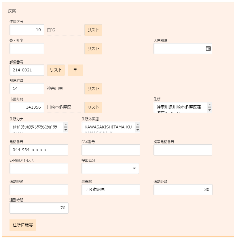 ※寮・社宅コードを入力した場合、以下の四つのグループごとに寮社宅マスタの内容を上書きします。 ・郵便番号、都道府県、市区町村、住所、住所カナ、住所外国語 ・通勤経路、最寄り駅、通勤時間、通勤距離 ・電話番号 ・住所区分 ただし、寮社宅マスタに一つも設定がないグループは上書きを行いません。 |