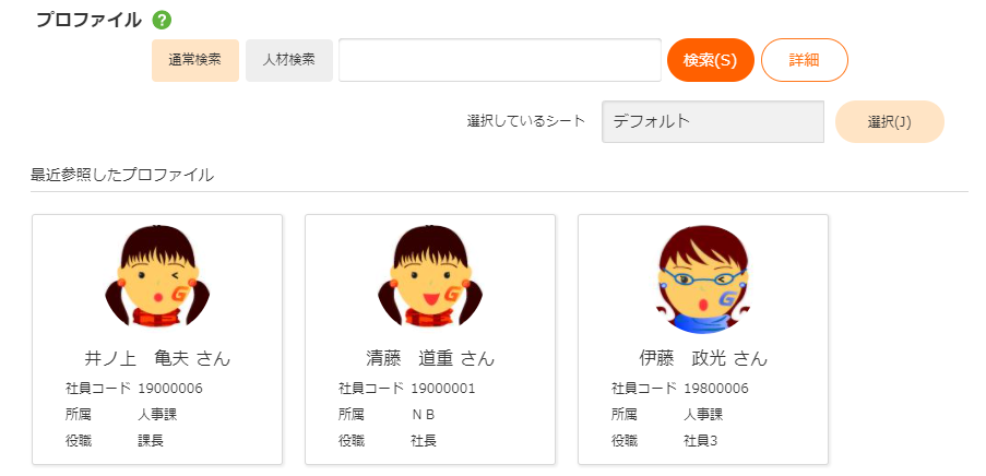 利用者が最近参照した社員を表示します。 社員の情報は顔社員、氏名、社員コード、所属名称、役職名称を表示します。 クリック時、選択した社員のプロファイル表示を表示します。 |